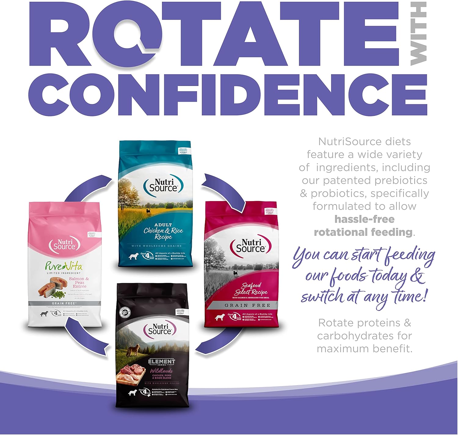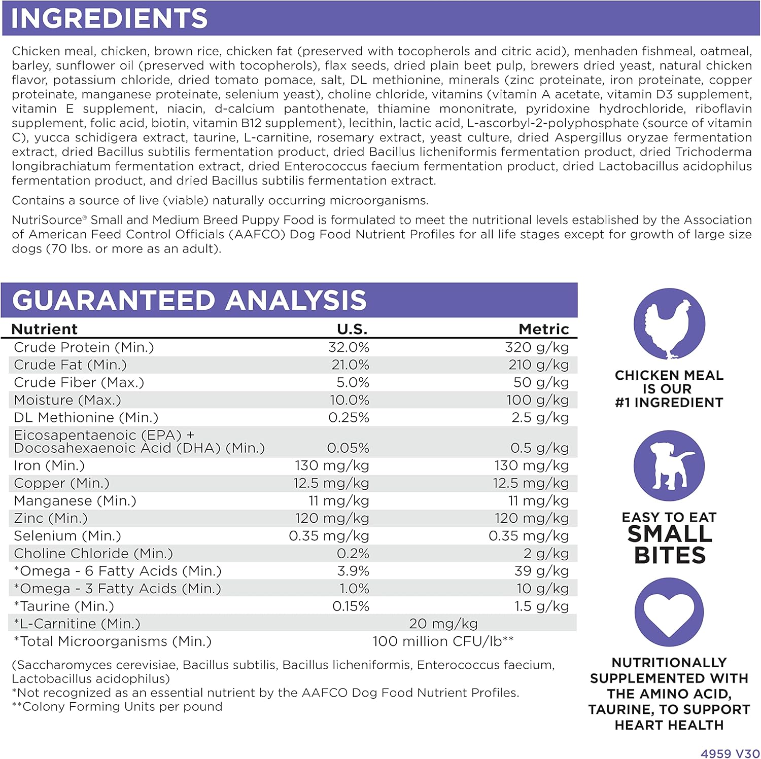 About this item CONTAINS: (1) 26LB Bag of NutriSource Chicken Meal and Rice Dry Dog Food for Small and Medium Breeds As a member of our grain inclusive series, NutriSource Chicken Meal and Rice Dry Dog Food is formulated to meet AAFCO guidelines for all lifestages NutriSource grain inclusive formulas deliver compact nutrition and include prebiotics and probiotics to help support a healthy gut Balanced Omega-3 and Omega-6 fatty acids along with L-Carnitine, taurine, choline chloride and DL Methionine supplementation to promote heart health make NutriSource grain inclusive formulas stand out Go Full Circle: Give your dog the variety they crave, maintain a healthy gut with rotational feeding, and optimize nutrition by introducing diverse proteins—all with simple steps, tasty options, improved digestion, less scratching, more energy, and a fun and fresh approach to keep your pup happy. › See more product details