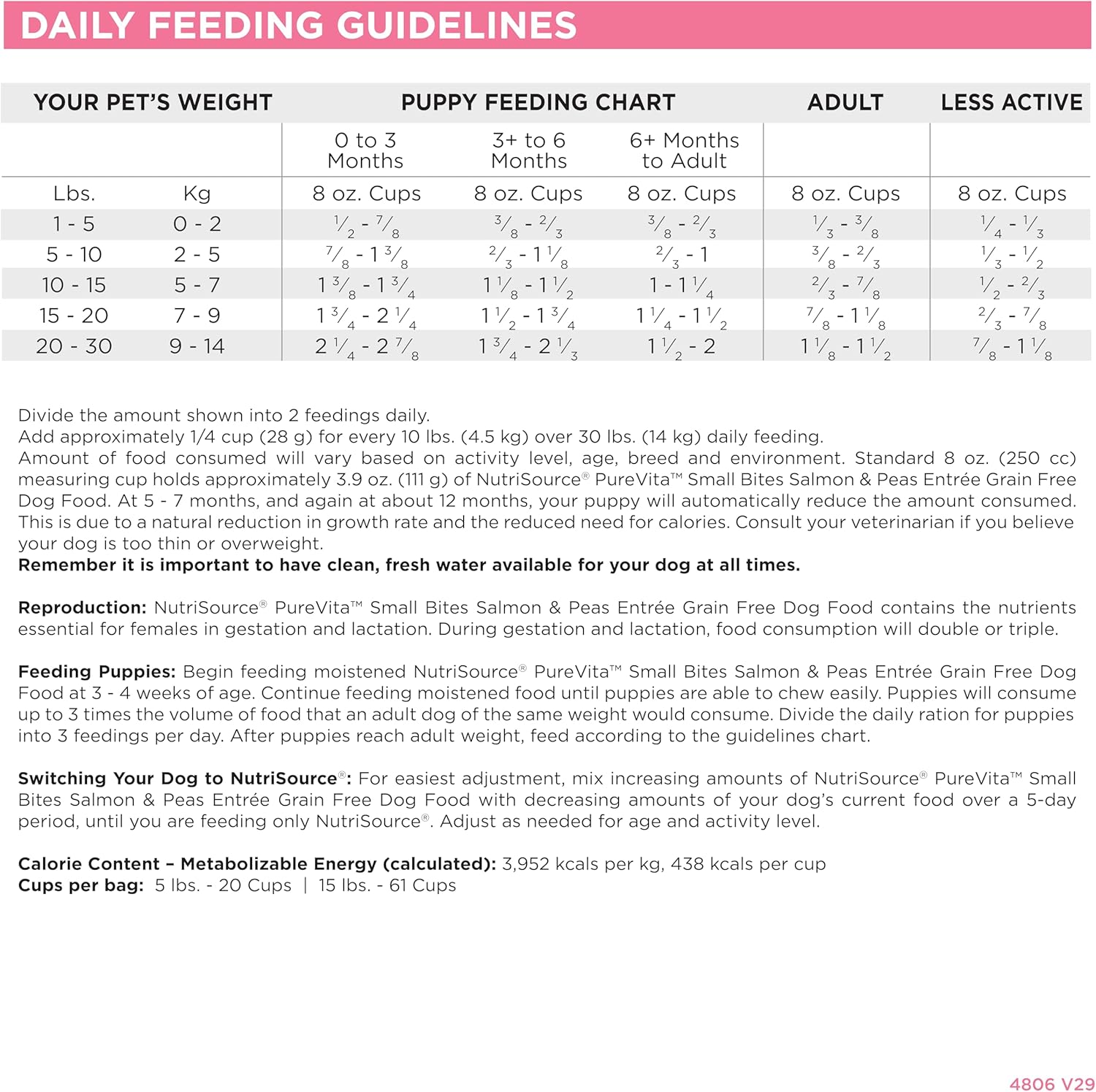 - Directions: Please refer to the feeding guide located on the back of the bag for size-specific feeding instructions