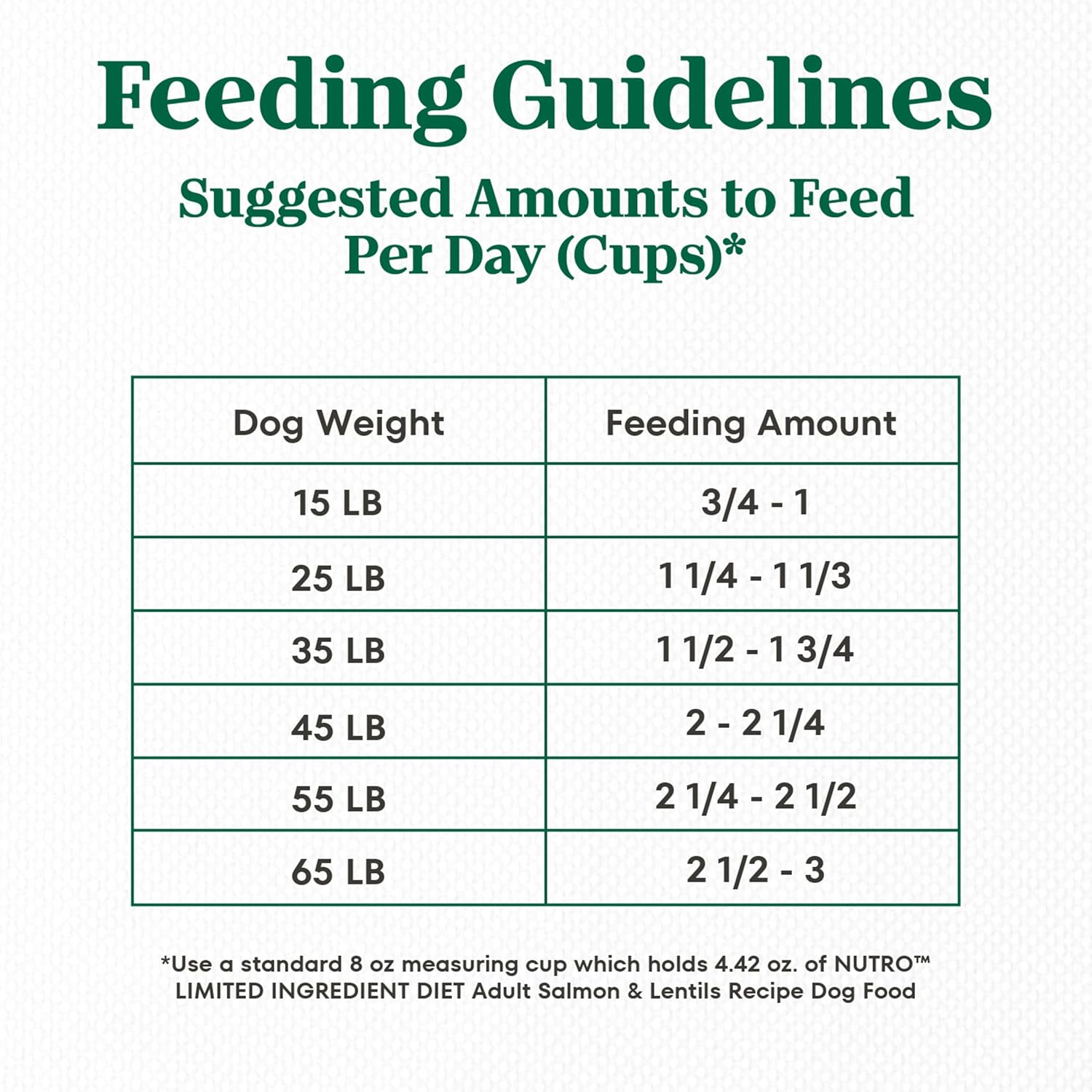 - Directions: Suggested Amounts to Feed Per Day (Cups)‡ Dog Weight - Feeding Amount 15 lbs. - 1 cup 25 lbs. - 1 1/3 cup 35 lbs. - 1 2/3 cup 45 lbs. - 2 cup 55 lbs. - 2 1/3 cup 65 lbs. - 2 2/3 cup ‡Use a standard 8 oz. measuring cup which holds 4.06 oz. of NUTRO™ Limited Ingredient Diet Adult Salmon & Lentils Recipe Dog Food