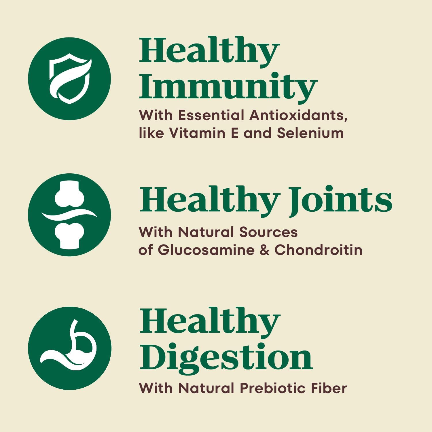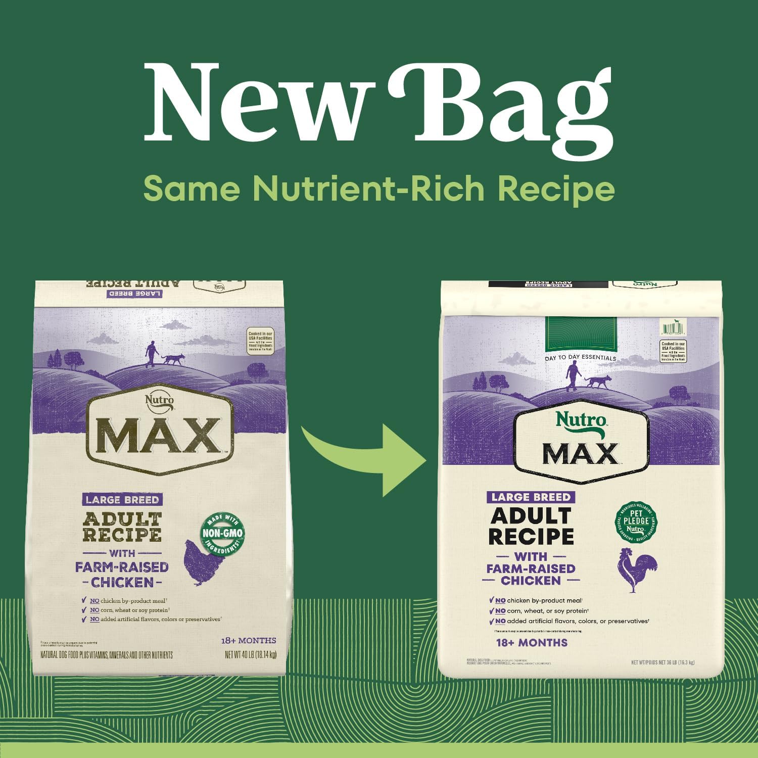 Nutro Max recipes make it easy to provide the high-quality nutrition your pet needs and the flavorful food they crave Nutro Max Adult Large Breed Dry Dog Food, with Farm-Raised Chicken supports a healthy skin and coat, healthy digestion and healthy immunity, resulting in support for your dog’s vitality Made with natural sources of Glucosamine and Chondroitin, this dry dog food recipe supports healthy joints With a high-quality protein source as the #1 ingredient, this dry dog food recipe is designed to help keep your large breed dog trim and fit Crafted with no chicken by-product meal, corn, wheat, soy protein or artificial preservatives, flavors, or colors, although trace amounts may be present due to potential cross-contact during manufacturing, you can feel confident giving your dog this quality dry dog food recipe Nutro Max serves quality and tasty ingredients that pets love while nourishing their wellbeing