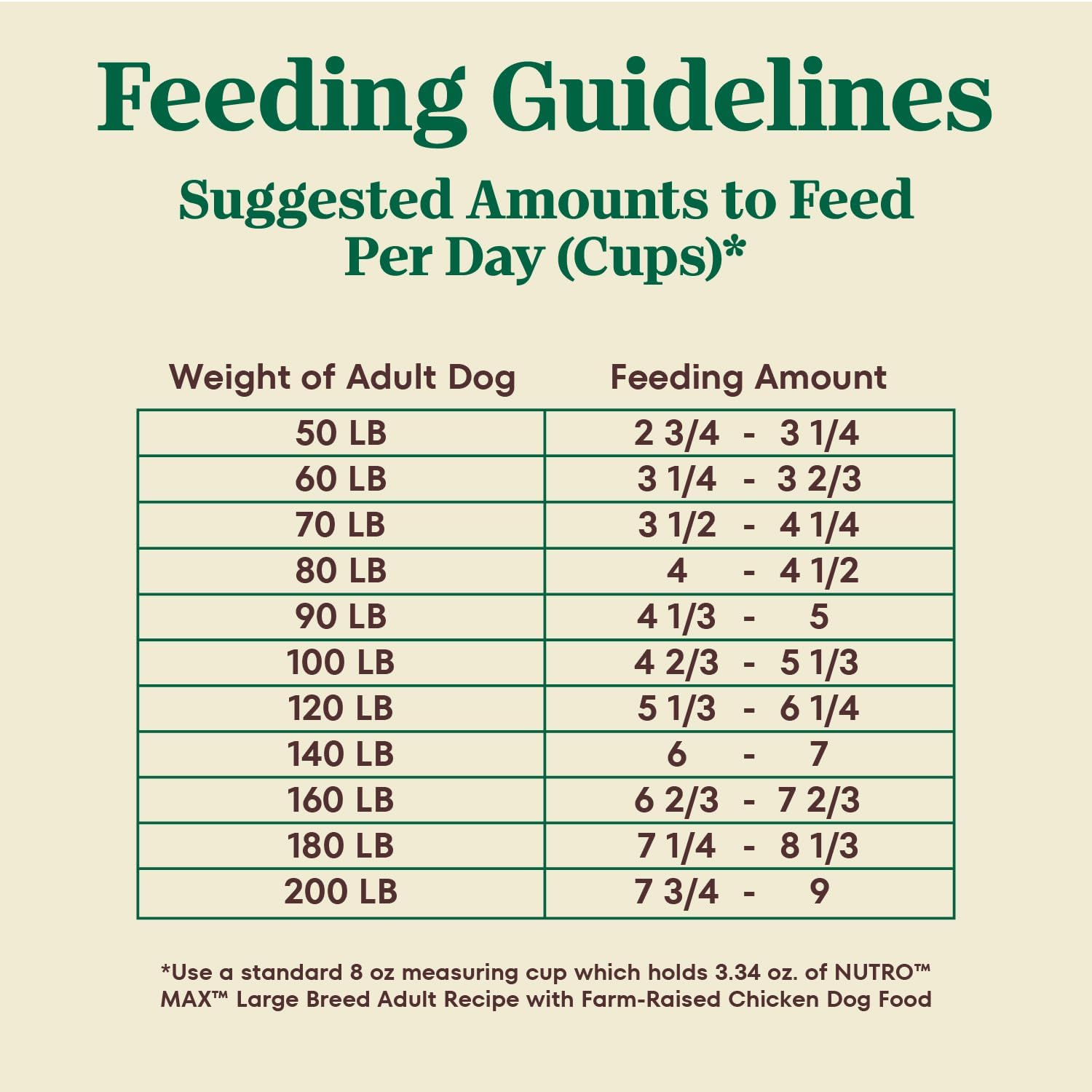 - Directions: FEEDING GUIDELINES • These are the recommended feeding amounts based on the ideal body condition for adult dogs of various weights. Individual dogs’ energy requirements may differ. Adjust the amount fed to obtain or maintain your dog’s optimum weight. Keep fresh drinking water available at all times, provide plenty of exercise and see your veterinarian regularly. Serve dry or lightly moistened. • Every cup of our food is nutrient dense, so your dog gets the right amount of calories in a complete and nutritious meal. • To help maintain freshness, seal bag tightly and store in a cool, dry location. Suggested Amounts to Feed Per Day (Cups)‡ Dog Weight Feeding Amount 50 LB 2 3/4 - 3 1/4 60 LB 3 1/4 - 3 2/3 70 LB 3 1/2 - 4 1/4 80 LB 4 - 4 1/2 90 LB 4 1/3 - 5 100 LB 4 2/3 - 5 1/3 120 LB 5 1/3 - 6 1/4 140 LB 6 - 7 160 LB 6 2/3 - 7 2/3 180 LB 7 1/4 - 8 1/3 200 LB 7 3/4 - 9 ‡Use a standard 8 oz. measuring cup which holds 3.34 oz. of NUTRO™ MAX™ Large Breed Adult Recipe with Farm-Raised Chicken Dog Food. Transitioning to Our Food If switching to this recipe or feeding NUTRO™ MAX™ Dog Food for the first time, we suggest you blend increasing amounts of the new recipe with your old food for six days. For 2 days, 25% NUTRO™ MAX™ Dog Food, 75% Old Food For 2 days, 50% NUTRO™ MAX™ Dog Food, 50% Old Food For 2 days, 75% NUTRO™ MAX™ Dog Food, 25% Old Food For a Lifetime, 100% NUTRO™ MAX™ Dog Food