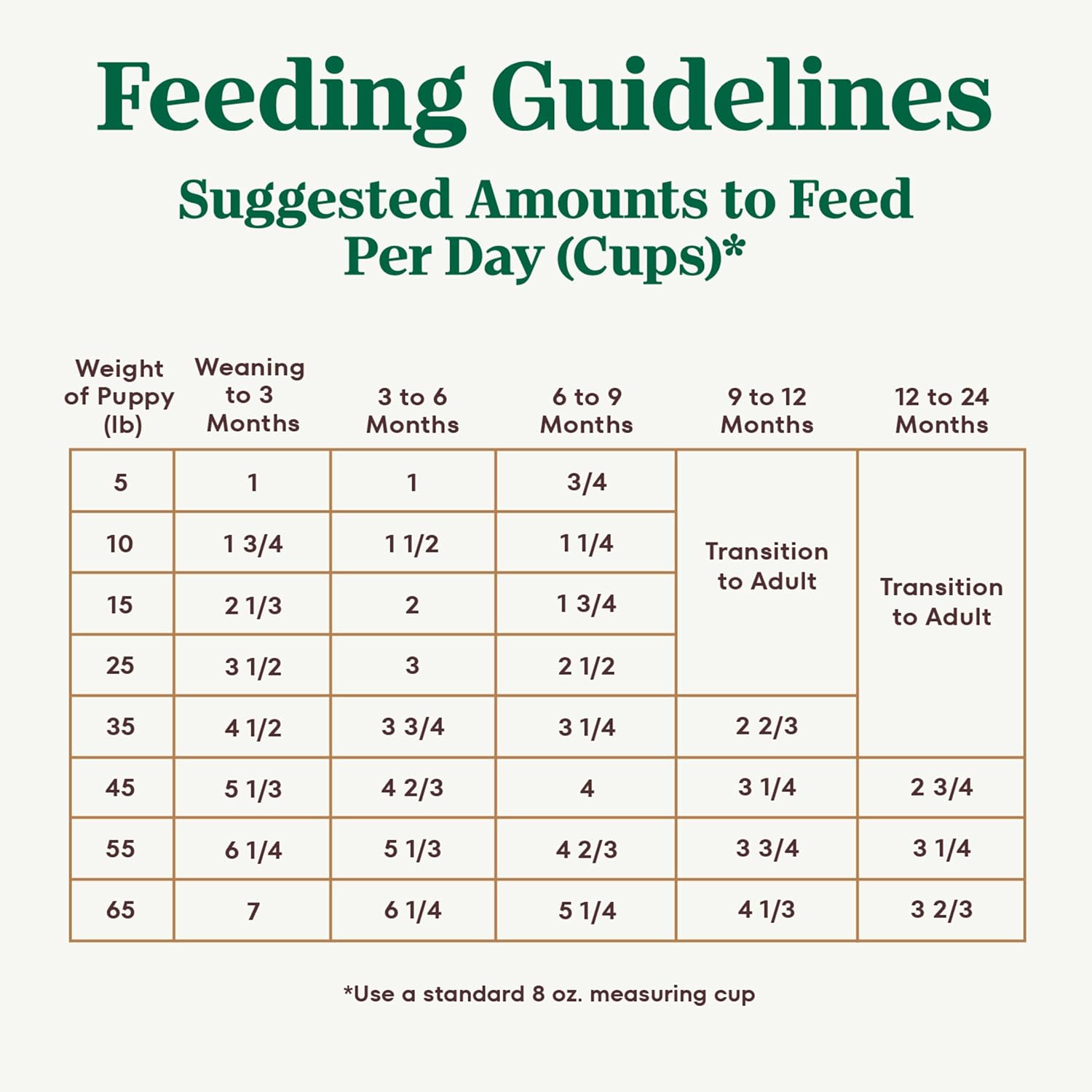 - Directions: Puppy Weight weaning - 3 months; 3 - 6 months; 6 - 9 months; 9 - 12 months; 12 - 24 months 5 lbs. 1; 1; 3/4; --; -- 10 lbs. 1 3/4; 1 1/2; 1 1/4; --; -- 15 lbs. 2 1/3; 2; 1 3/4; --; -- 25 lbs. 3 1/2; 3; 2 1/2; --; -- 35 lbs. 4 1/2; 3 3/4; 3 1/4; 2 2/3; -- 45 lbs. 5 1/3; 4 2/3; 4; 3 1/4; 2 3/4 55 lbs. 6 1/4; 5 1/3; 4 2/3; 3 3/4; 3 1/4 65 lbs. 7; 6 1/4; 5 1/4; 4 1/3; 3 2/3