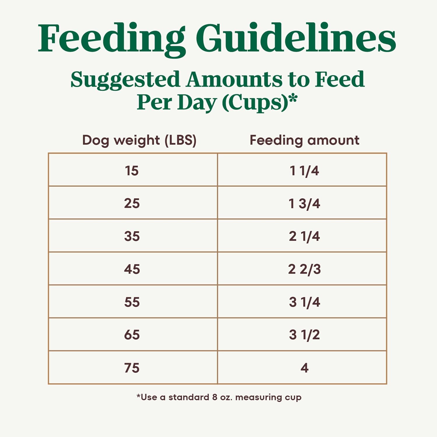 - Directions: 15 lbs. 1 1/4 cups 25 lbs. 1 3/4 cups 35 lbs. 2 1/4 cups 45 lbs. 2 2/3 cups 55 lbs. 3 cups 65 lbs. 3 1/2 cups 75 lbs 4 cups