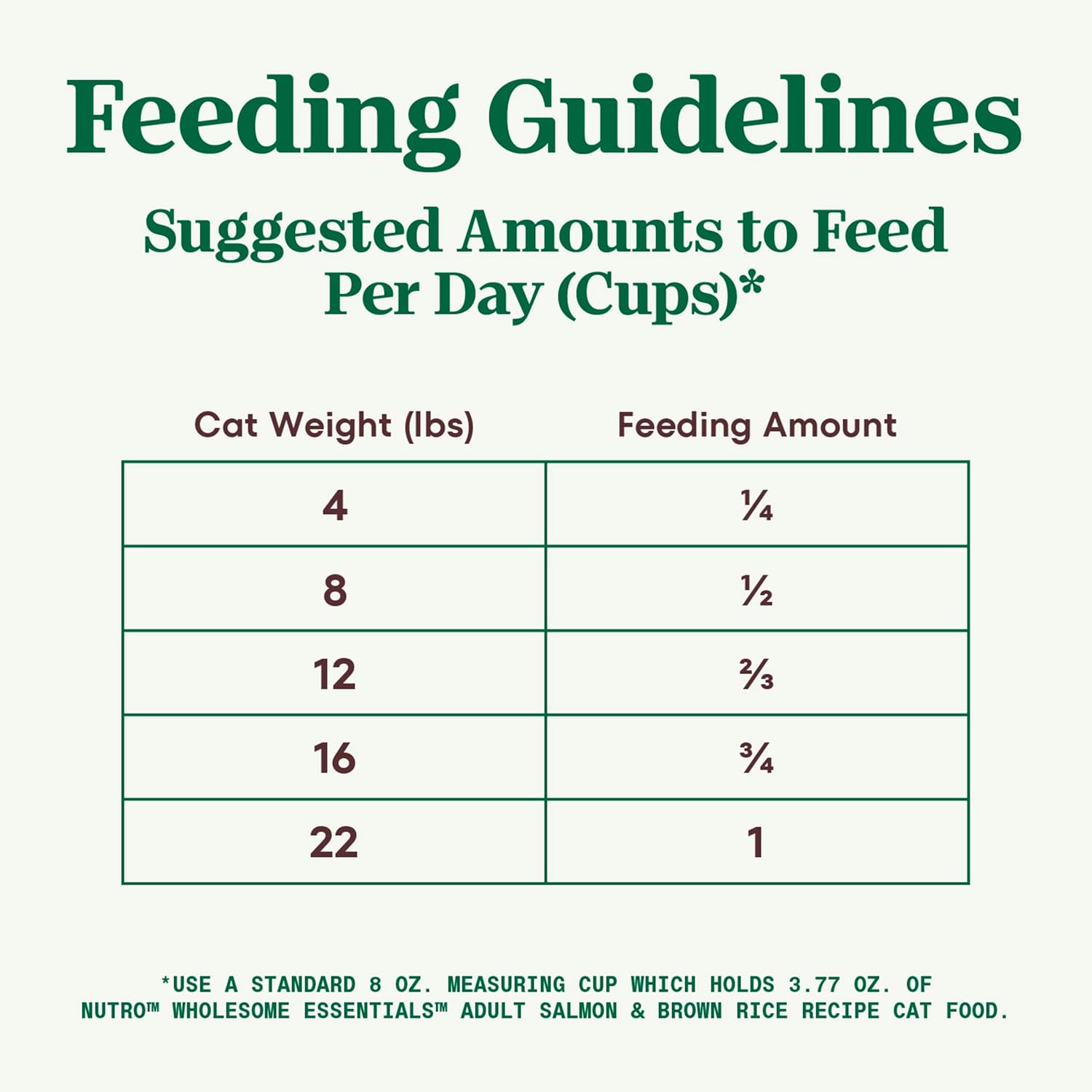 - Directions: These are the recommended feeding amounts based on the ideal body condition for adult cats of various weights. Individual cats’ energy requirements may differ. Adjust the amount fed to obtain or maintain your cat’s optimum weight. Keep fresh drinking water available at all times, provide plenty of exercise and see your veterinarian regularly. Serve dry or lightly moistened.Every cup of our food is nutrient dense so your cat gets the right amount of calories in a complete and nutritious mealTo help maintain freshness, seal bag tightly and store in a cool, dry location.Suggested Amounts to Feed Per Day (Cups)‡Cat Weight Feeding Amount4 lbs. 1/48 lbs. 1/212 lbs. 2/316 lbs. 3/422 lbs. 1‡Use a standard 8 oz. measuring cup which holds 3.85 oz. of NUTRO™ WHOLESOME ESSENTIALS™ Adult Cat Salmon & Brown Rice Recipe Cat Food.Transitioning To Our FoodIf feeding NUTRO™ Cat Food for the first time or changing recipes, we suggest you blend increasing amounts of the new recipe with your old cat food for six days.
