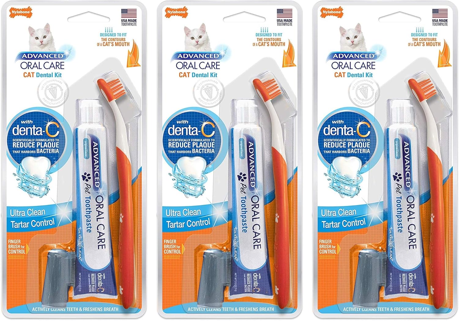 Nylabone Advanced Oral Care For Cats Complete Dental Kit comes with a 2.5 oz. tube of Tartar Control Toothpaste for cats, a toothbrush designed to fit the contours of a cat's mouth, and a fingerbrush. Complete Dental Kit for Cats with Denta-C is scientifically formulated to reduce plaque that harbors bacteria. Advanced Oral Care Tartar Control Toothpaste freshens breath, cleans teeth, and reduces plaque and tartar. Cats and kittens over 3 months can be easily trained to accept daily tooth brushing. Preventative dental care reduces the risk of developing periodontal disease, which can lead to serious health issues for your cat. Establishing a daily routine of proper dental care may extend the life of your pet.