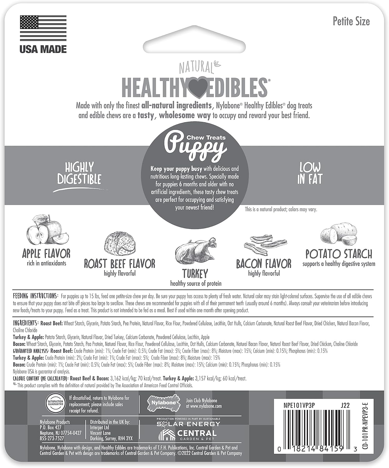 ABOUT HEALTHY EDIBLES Reward and occupy your best friend with Healthy Edibles dog treats! Made with no artificial colors, flavors, or preservatives, these natural dog treats come in many delicious flavors, engaging shapes, and sizes for every dog—even puppies! THREE DIFFERENT FLAVORS TO SATISFY YOUR PUPPYSpecially made for puppies, this variety pack comes with 3 puppy treats in delicious flavors: bacon, roast beef, and turkey & apple. Each of these long-lasting puppy chews are highly digestible and made with the finest natural ingredients for a nutritious and yummy reward! GUARANTEED YOUR DOG WILL LOVE IT Before we introduce new dog products to furry friends and pet parents everywhere, we make sure our very own dogs love them first! If you’re not happy with your Nylabone chew treat for any reason, simply return it to us with the sales receipt for your money back. Or, reach out to our Consumer Care team so we can help make it right (and talk about how much we also love our dogs). MEET NYLABONE Ever since introducing our very first chew toy in 1955, Nylabone has been helping pet parents take the best possible care of their furry friends. Fast-forward 60+ years and our family-founded company is still trusted for tasty treats, high-quality chew toys, fun play toys, and easy-to-use dental products!