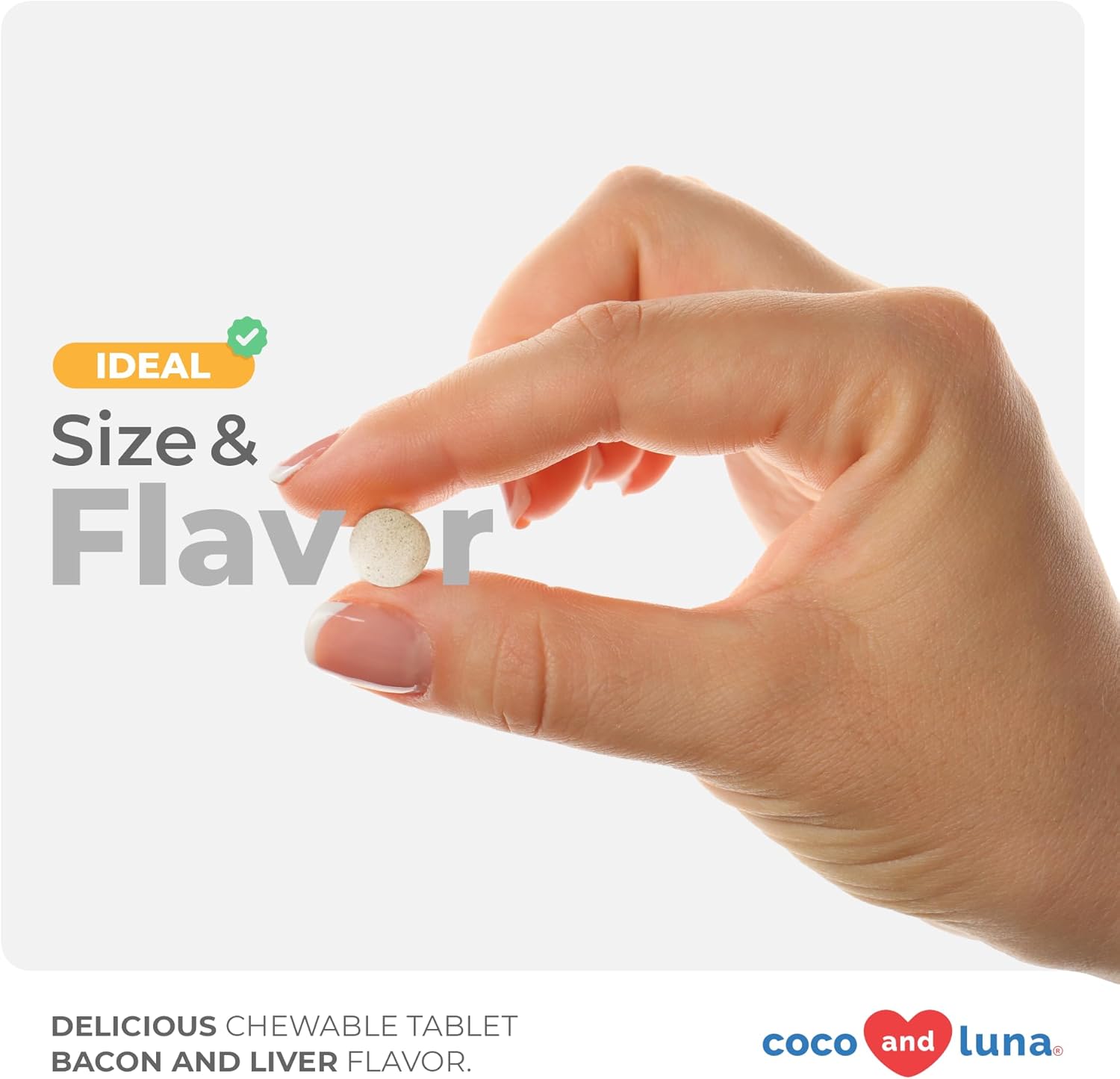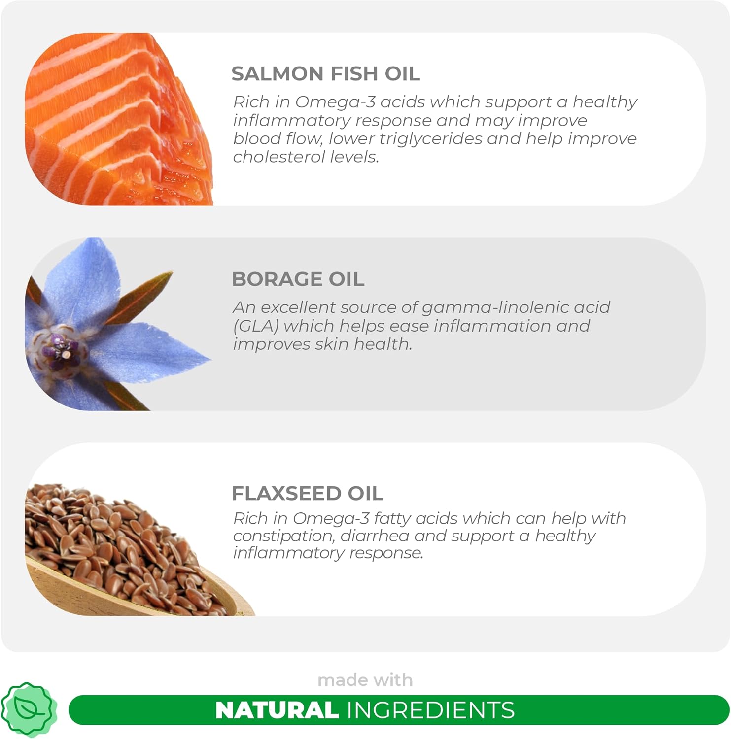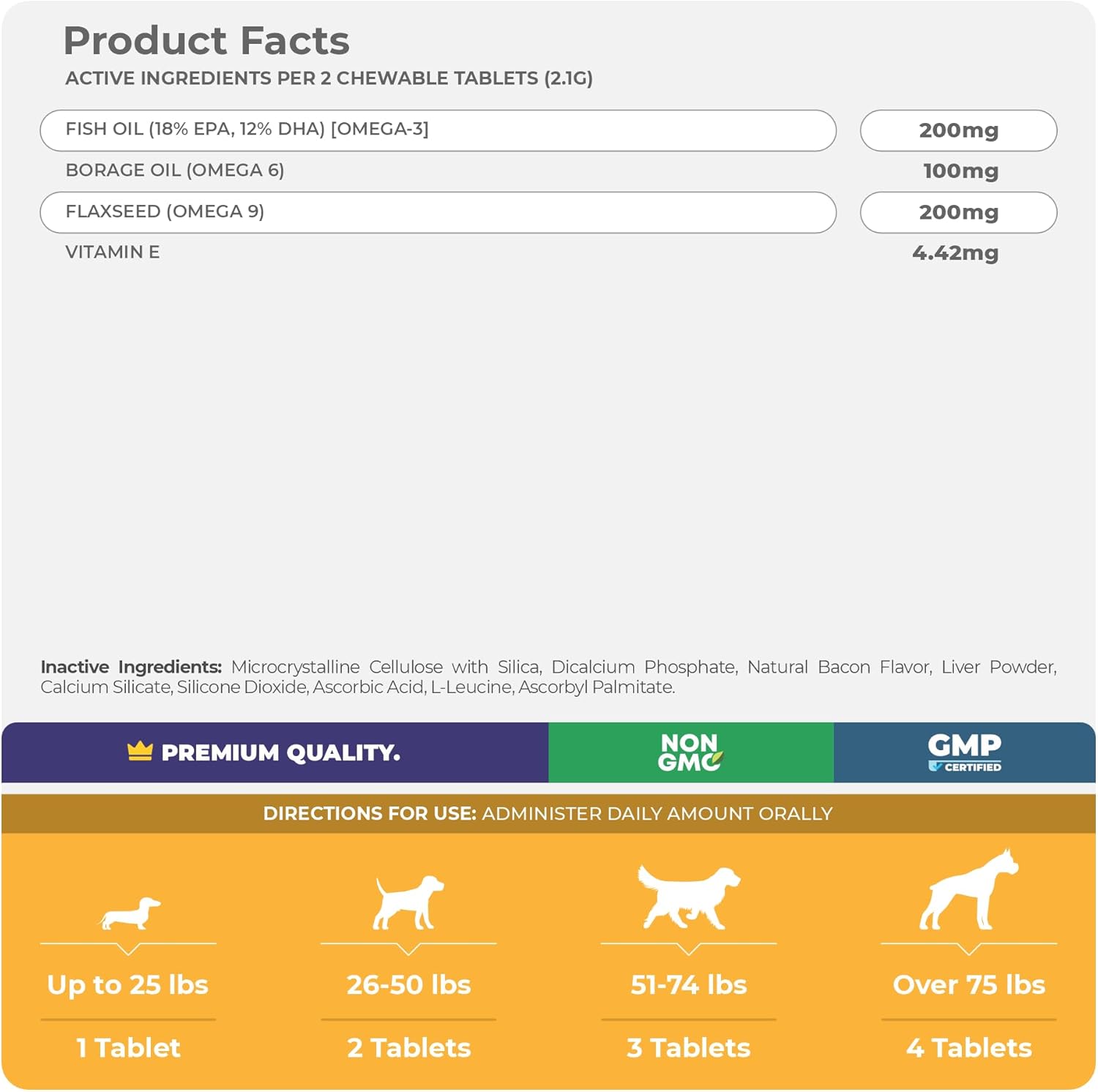 About this item Soothe Itching - Coco and Luna Omega 3 tablets are an incredible source of fish oil which will help soothe your dog’s dry and itchy skin as well as helping with hot spots. Immune System - Our natural formula contains Vitamin E which is a powerful antioxidant that supports and enhances your dog’s immune system while also having Borage Oil which has anti-inflammatory properties. Heart Support - With multiple essential fatty acids such as EPA, DHA, GLA and ALA, our product will help in protecting and supporting your dog’s heart. A Brand You Can Trust - We understand how much your pet’s health and wellbeing mean to you, so our products are manufactured in FDA-registered facilities that are NSF and GMP-certified in the USA. Made in the USA - All our products are made in the USA and are veterinarian approved as well as hypoallergenic. › See more product details