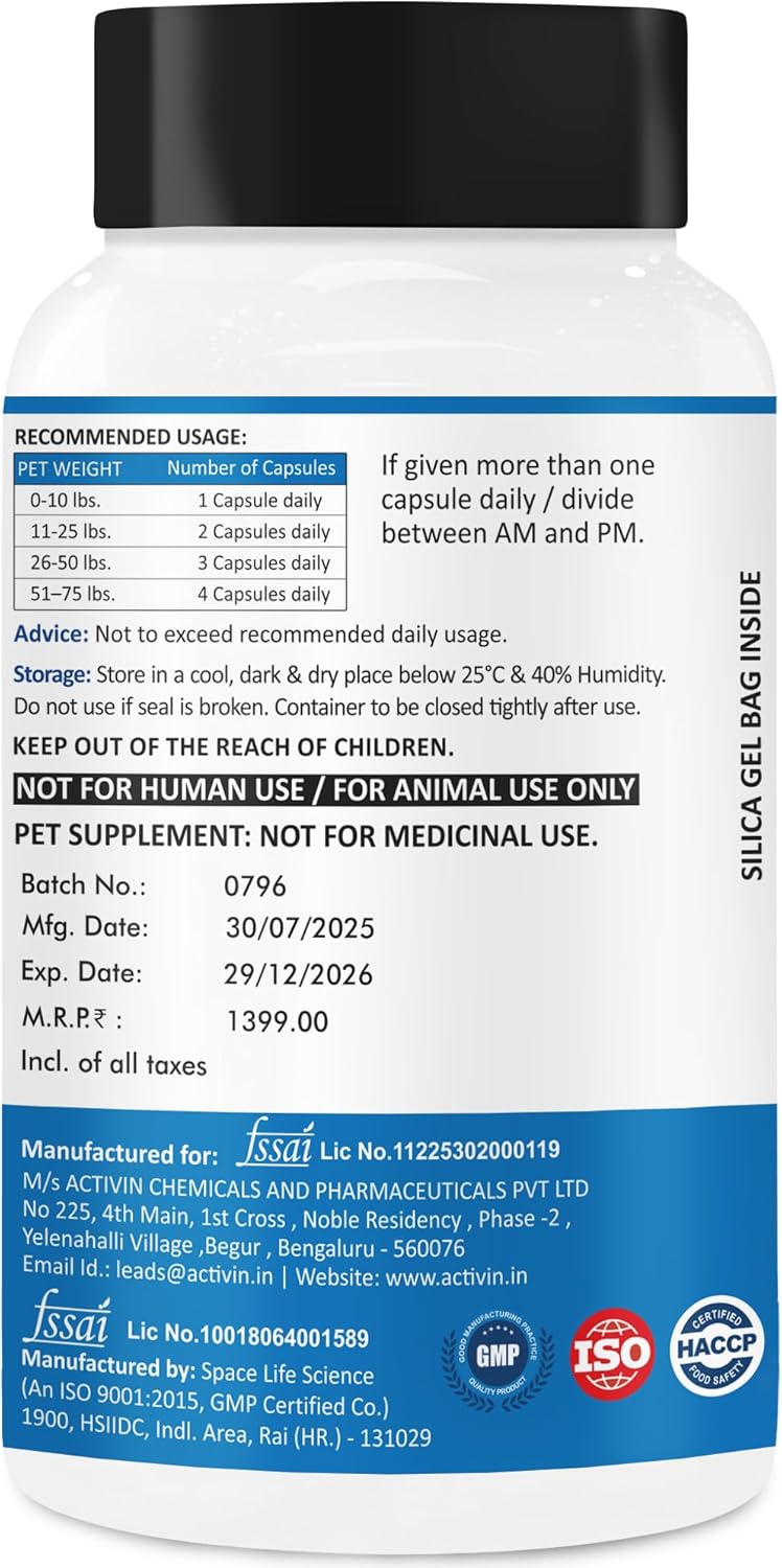 - Directions: Pet Weight 0-25 lbs 1 capsule/day. 26-50 lbs 2 capsules/day. 51-75 lbs 3 capsules/day. 76+ lbs 4 capsules/day.