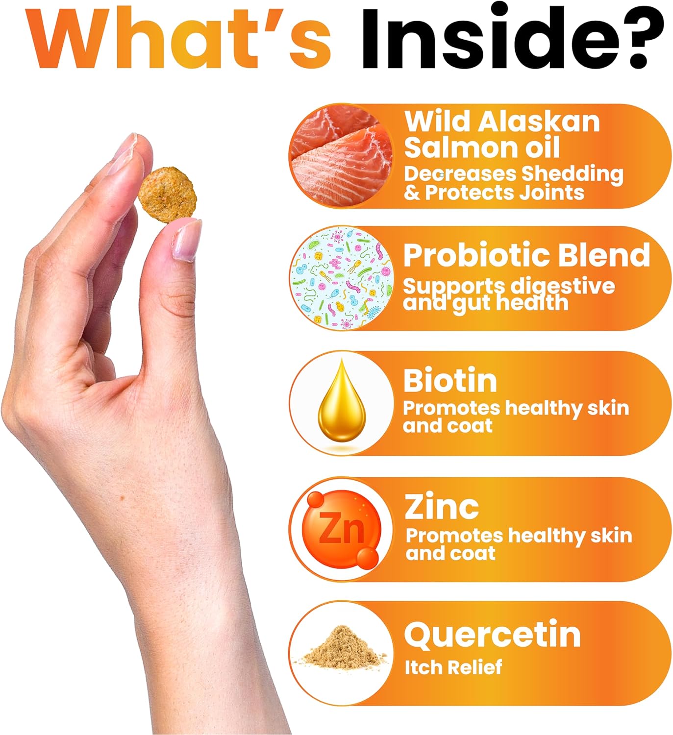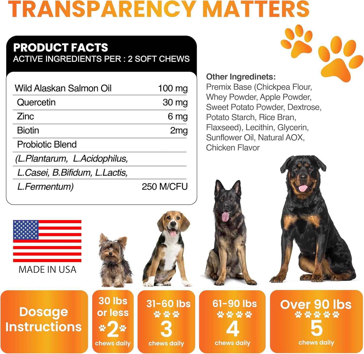 About this item Itch & Dog Allergy Relief: Containing important amounts of flax seed oil and Alaskan salmon oil, our skin and coat supplement for dogs is packed with Omega 3, 6 and 9, DHA and EPA, as well as biotin and zinc for your dog’s long-term health! Soft and Shiny Coat: These omega 3 fish oil for dogs chews promote a stronger, shinier and healthier looking coat all year round, helping minimize shedding and providing seasonal or occasional allergy relief! Healthy Skin: Say goodbye to hot spots, excessive itchiness, redness and licking, as well as dry itchy skin which hinders your dog’s comfort on a daily basis! This dog omega 3 supplement can help reduce scratching, constant licking and skin issues Made in USA: Unlike similar products on the market, these dog vitamins for skin and coat allergies are made with 100% safe all-natural ingredients, containing no nasty GMOs, artificial fillers, preservatives, colors or flavors! Joint, Heart & Immune Support: This dog shedding supplement comes in the form of an easy to digest, delicious chicken flavored chew, perfect for picky eaters! › See more product details