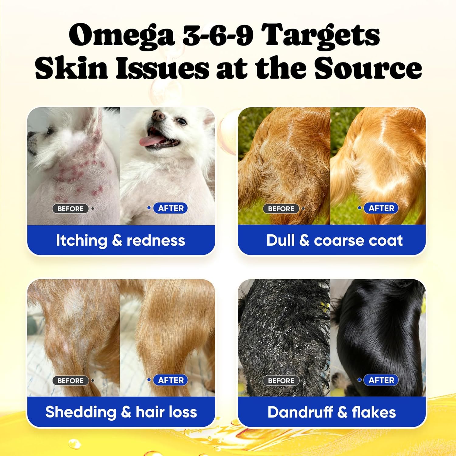 About this item 【Higher Omega-3 from 8 Fish Oils】 Made with 8 premium deep-sea fish oils including wild-caught salmon oil for dogs, sardine, anchovy, mackerel, and other ocean sources. This advanced dog fish oil delivers higher levels of DHA & EPA, supporting a healthy coat, skin, and overall wellness. A perfect omega 3 fish oil for dogs for pet parents seeking quality nutrition in one chew. 【Complete Omega 3-6-9 Balance】While other dog fish oil supplements often emphasize only Omega-3, our product provides a complete and scientifically balanced multi-Omega species. Pets cannot produce Omega-3 and 6 on their own, while Omega-9 works best in synergy —our combination of fish oil for dogs and salmon oil for dogs ensures truly balanced nutrition. It’s the smarter, more complete dog oil for skin and coat, designed for lifelong vitality. 【Pure Fish Oils, No Fillers】 Crafted with 100% pure fish oils from deep-sea sources, including sardine, mackerel, anchovy, and salmon oil for dogs, with no filler oils, artificial colors or flavors. This clean, high-quality dog omega 3 fish oil offers reliable nutrition for skin, coat, joints, and overall health, making it a trusted choice among premium fish oil chews for dogs. 【Shining Coat & Relieve Itching】Rich in EPA and DHA, our formula soothes your dog’s dry, itchy skin and helps combat seasonal allergies.With consistent use of our fish oil for dogs, your dog will enjoy a softer, shinier coat and significantly less shedding. This dog oil formula is especially beneficial for pups with sensitive skin or recurring dermatological concerns. 【Joint, Heart & Gut Support】Beyond skin and coat benefits, our dog fish oil promotes joint flexibility, immune resilience, and supports heart and brain function. Powered by omega 3 fish oil for dogs, it’s ideal for active, growing, senior, or large-breed dogs who need sustained mobility and comfort throughout life. A truly multi-functional dog omega 3 fish oil for complete care. 【Buy with Confidence】Each jar contains 180 soft chews—up to 4 months of supply depending on dog weight. These chews incorporate fish oil dogs adore and salmon oil for dogs in a no-spill, fuss-free form. Far simpler than liquids or capsules, this high-value supplement delivers trusted results. 👉️Any product issues, please contact us via Amazon Message Center. Enjoy a FULL-REFUND, NO QUESTIONS ASKED! › See more product details
