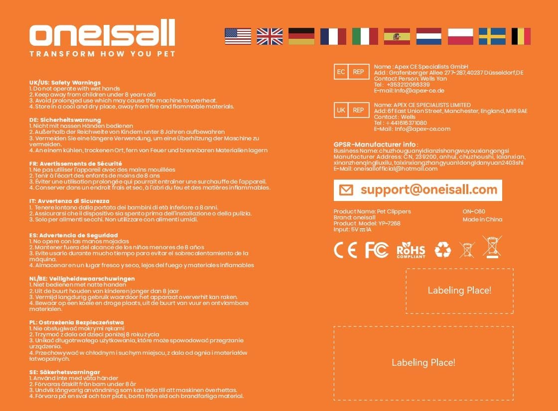 About this item Powerful Motor-Easy to Trim:5 speed Powerful Motor is easy to cut through matted hair like a butter. Very suitable for novices Quiet Design-Let Cats Not Scare:The noise when the cat clippers work is less than 55 decibels, which perfect for nervous cats Safe Sharp Blade and Waterproof Design:Easy for Novices to Use.The unique blade and IPX7 waterproof design can easily clean the cat clipper under running water after trimming cat hair quickly. It is easy for novices to achieve home grooming for cats Long Lasting Battery & LCD Display: Charging for 1.5 Hours, this cat grooming kit will work last for 120 minutes. With LCD display, you can easily know how many minutes the battery last, helping you better control the grooming work What You Get: oneisall 7268 cat clipper, 4 guide guards (3mm/ 6mm/ 9mm/ 12mm), cleaning brush, comb, scissor, usb charger. Includes everything you need to trim your pet’s hair › See more product details