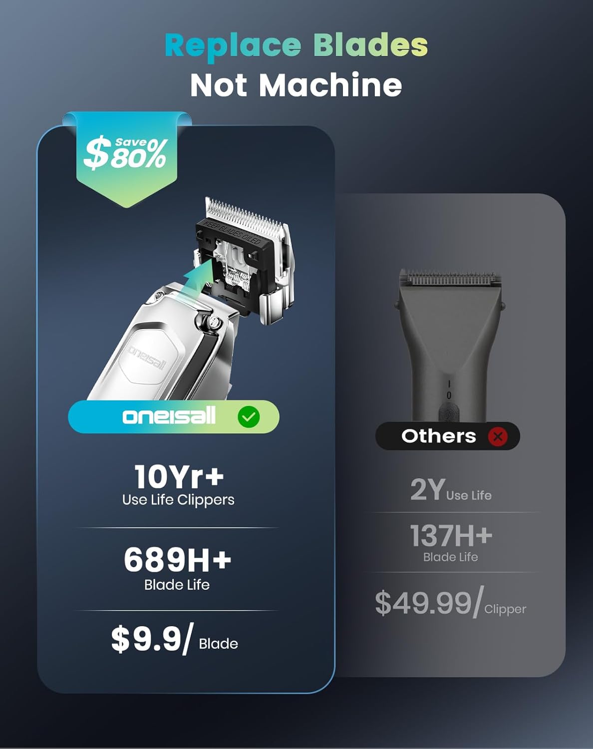 About this item Effortlessly Cut ALL Coat Types:Whether it's a Husky's dense undercoat, Poodle's curly tangles, or Golden Retriever's long flowing fur. oneisall dog clippers slice through them like butter! Pro-grade stainless steel blades + 6800RPM motor = 50% faster shaving. oneisall dog grooming clippers make home grooming effortless. Stays Razor-Sharp Through Multiple Cuts: oneisall dog clippers are made of high hardness, corrosion-resistant stainless steel blade, which can be used continuously for 9,000+ times, which saves you the cost of frequent replacement of the blade! No Snagging, No Pulling, give your pet a better shaving experience! Innovative detachable blade design, no place for hair debris to hide, super easy to clean and maintain! Ultra-Quiet & Low Vibration:The noise of the dog clippers is lower than 50db when running. Ideal for nervous pets, this dog clipper will make shaving a relaxing experience and help your dog love shaving! Groom Anytime, Anywhere!:oneisall cordless dog clippers give you the freedom to trim indoors or outdoors—no cords, no limits. Perfect for beginners and pet owners grooming at home! 240-Minute Long-Runtime:Powered by a robust 2000mAh battery, oneisall dog clippers for grooming deliver up to 4 hours of cordless grooming, enough for 4+ full haircuts on large dogs. Perfect for professional groomers and multi-dog households!The LED Power Meter can always know remaining battery.Type-C Quick Charge make fully recharge in just 1 hour. 730-Day Replacement Guarantee:During the 2-year warranty period, contact our customer service for any issues with your PC18 dog clippers. oneisall will troubleshoot or replace your unit — no repairs needed. › See more product details