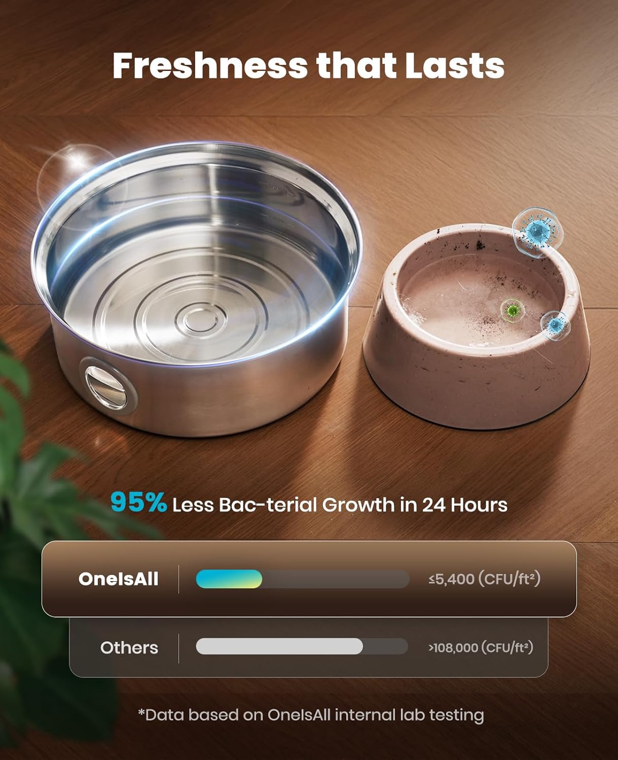 About this item : Healthier & Durable! Give your pets the cleanest, safest water with our rust-resistant 304 stainless steel dog water fountain. Upgraded 4 filter layers effectively capture impurities like fur, odors, etc. Unlike plastic fountains, our dishwasher-safe, easy-to-clean design ensures fresh water daily—protecting your pet’s kidneys and overall health. : oneisall dog fountain water bowl inside with the 7L large capacity, provides enough water for around an week even you are on vacation for all breed dogs cats and pets, reduces the frequency of refill while keep your fur babies' kidney and urinary health. This pet water fountain have an absolutely wide drinking area, encouraging your Multi-pets to be happy sharing water from all sides and the water won't spill out. : Equipped with a visual water level window, you can clearly observe the remaining water level without opening the cover. Never Run Dry! Worried about forgetting to refill? Our upgraded anti-dry pump alerts you with a red LED light when water runs low. Plus, the emergency reserve lid provides backup water during power outages—because pets should never go thirsty. : The mimics-flowing-water faucet entices picky dog and cat drinkers, making drinking interesting and clean, while entices them to drink more water. And the near-silent pump won’t disturb your peace. Perfect for anxious pets or light sleepers! :Our stainless steel dog fountain water bowl 𝘄𝗶𝘁𝗵 𝟯 𝗿𝗲𝗽𝗹𝗮𝗰𝗲𝗮𝗯𝗹𝗲 𝗳𝗶𝗹𝘁𝗲𝗿𝘀 making maintenance easier and more cost-effective. Our Higher stainless steel faucet fountain nozzle and heavier bowls are necessary for increased stability. This 304 stainless steel dog drink fountain has better firm motor to make the product last for a long time; most importantly our simple construction allows you to install remove and clean in one step. › See more product details