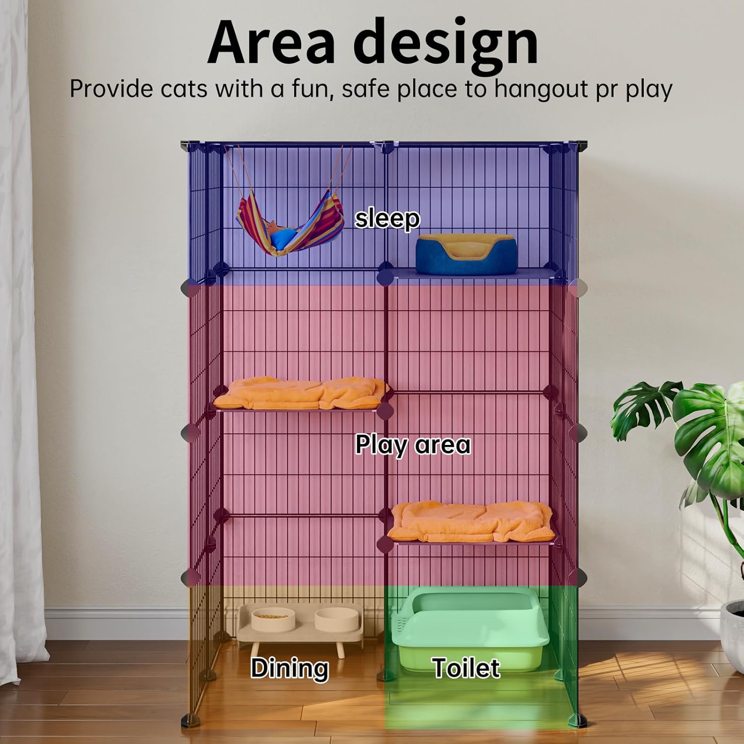 About this item 【Spacious and Comfy】 This catio renders ample space to house 1-2cats for play and rest; Features 2 doors and top skylight for cleaning, entering, feeding and convenient interactions. 【Sturdy & Safe】Sturdy and strong metal wire featuring a black coat finish to prevent rust.Note: Be sure to use the 150 zip-ties provided to ensure cage stability 【Sub-area Design 】 Upgrading the two-level platform will not hurt the cat's paws,You can put pet supplies in different areas 【Sub-area Design 】 Upgrading the two-level platform will not hurt the cat's paws,You can put pet supplies in different areas 【Easy To Assemble】 Only one people, clear instructions with no added 【Product dimensions】31.5x23.6x47.2 inches (LxWxH);The distance between the wire is only 1.15" and would not harm pets. › See more product details