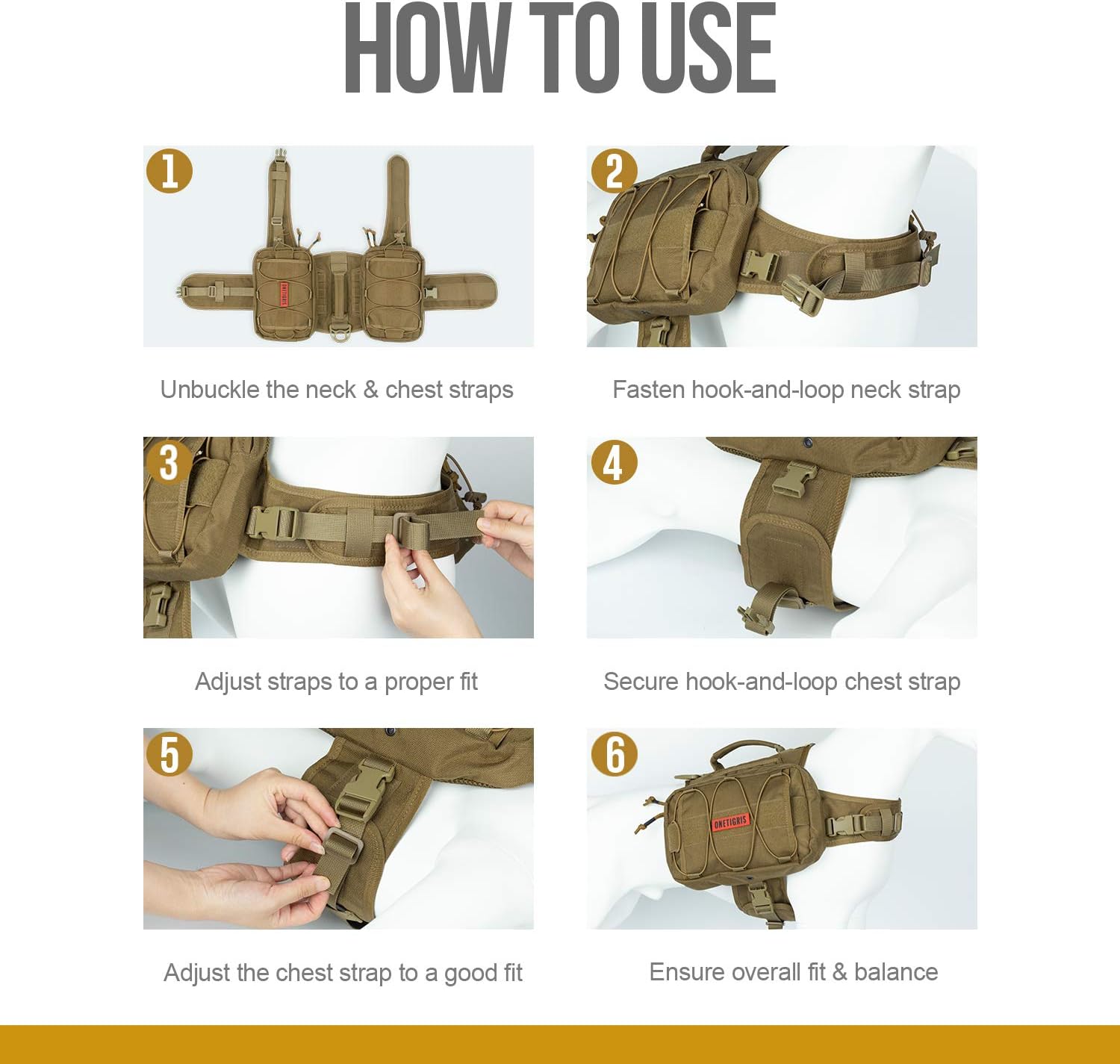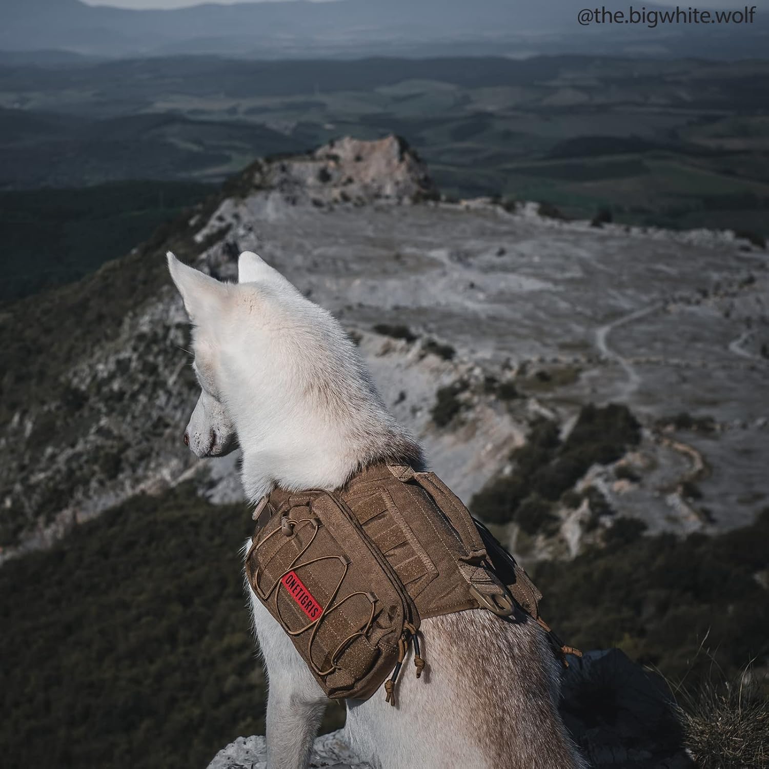 About this item OneTigris MAMMOTH Dog Pack: Durable 1000D nylon with mesh lining for breathability to maximize function and comfort on lengthier outings Storage Room: 3L pouch with two 2" by 7" loop panels on either side for carrying water, dog food, treats, toys; Each side pouch comes with an exterior horizontal umbrella pocket with cross-bungee cords for strapping on extra gear Hidden Zippers Design: To prevent the dog's hair from getting stuck in the zipper, also it's not easy to be unzipped when in use Adjustable Dog Harness Backpack: Hook-and-loop belly strap with UTX-Duraflex buckles so the pack stays in place and wrap dog's neck & belly around well Specifications for Large Version Pet Backpack: Net weight: 600g/21oz; Reinforced grab handle with UTX-Duraflex clip for leashes; 2 adjustable straps fits for different dog breeds and sizes with 21-31.5 inch neck & 29-36 inch chest › See more product details