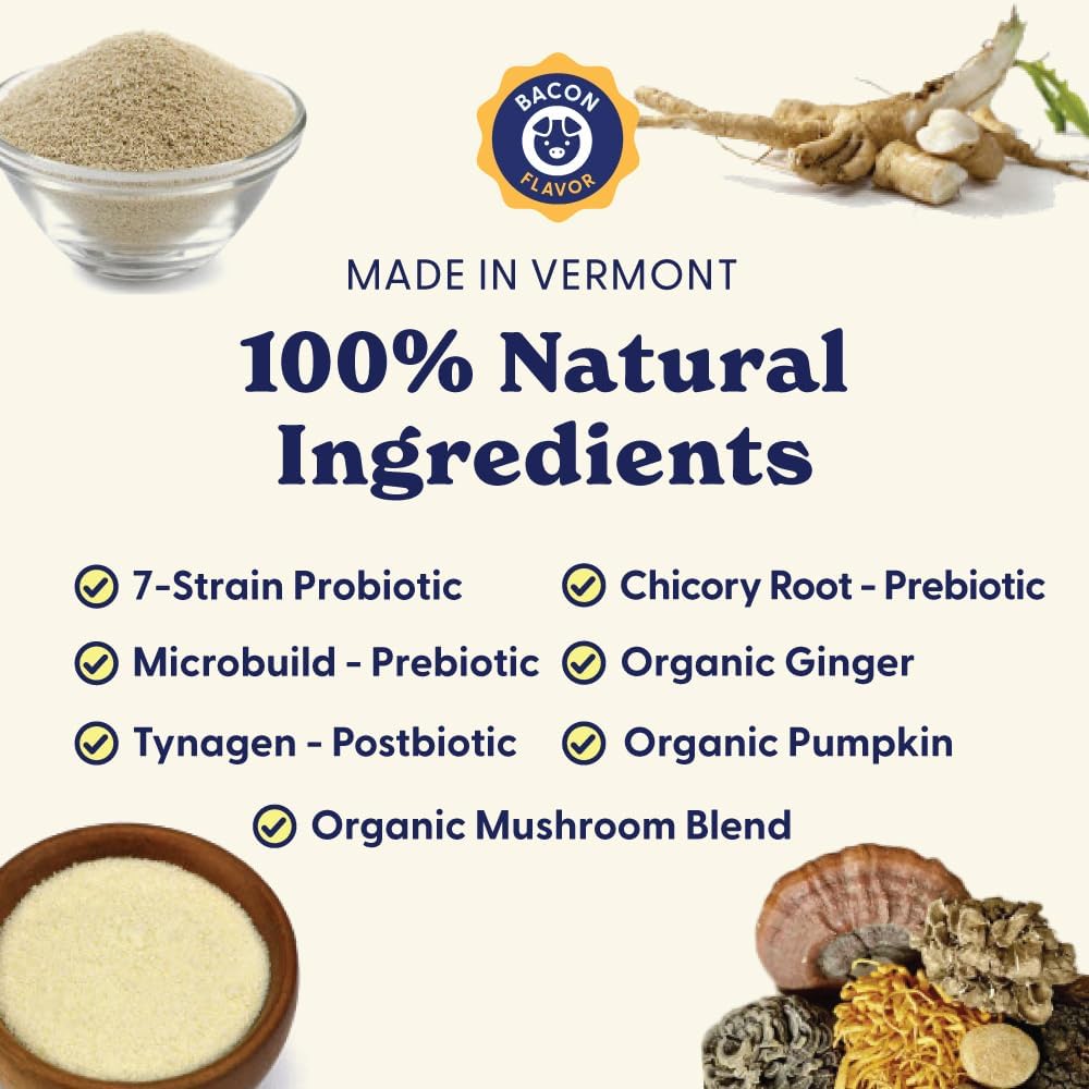 About this item 3 In 1 Formula: This 7-strain probiotic blend offers 5 billion CFUs of prebiotics, probiotics, and postbiotics to support your dog’s gut and immune health. Gut and Immune Support: Formulated to support balanced flora and seasonal comfort and skin health, Belly Buddies are designed to support your dog’s well-being inside and out. 100% Natural Ingredients: Your dog deserves real ingredients. These bacon-flavored soft chews blend organic ginger root, organic pumpkin, organic mushrooms, yucca, and astragalus root into one irresistible chew. Free from soy, wheat, and artificial colors/flavors. Quality You Can Trust: Vet-formulated and third-party tested to ensure your dog receives safe, effective, high-quality products. Who We Are: Our dedication to your dog's health is matched by our commitment to quality. All our products are made in Vermont, USA. At Origin Labs, we are proud to make products you can trust. › See more product details