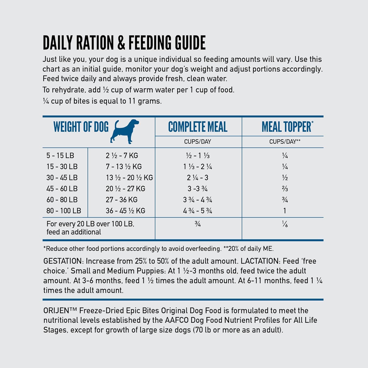 - Directions: EVERY DOG IS DIFFERENT Just like you, your dog is a unique individual so feeding amounts will vary. Use this chart as an initial guide, monitor your dog’s weight and adjust portions accordingly. For dogs greater than 60lbs, please visit orijen.com for feeding instructions. Feed twice daily and always provide fresh, clean water. DOG — GESTATION increase from 25% to 50% of the adult amount • LACTATION feed ‘free choice’ SMALL AND MEDIUM PUPPIES At 1 ½ - 3 months old, feed twice the adult amount. At 3-6 months, feed 1 ½ times the adult amount. At 6-11 months, feed 1 ¼ times the adult amount. Store dry food in a cool and dry environment. Refrigerate rehydrated food immediately and discard if unused after three days.