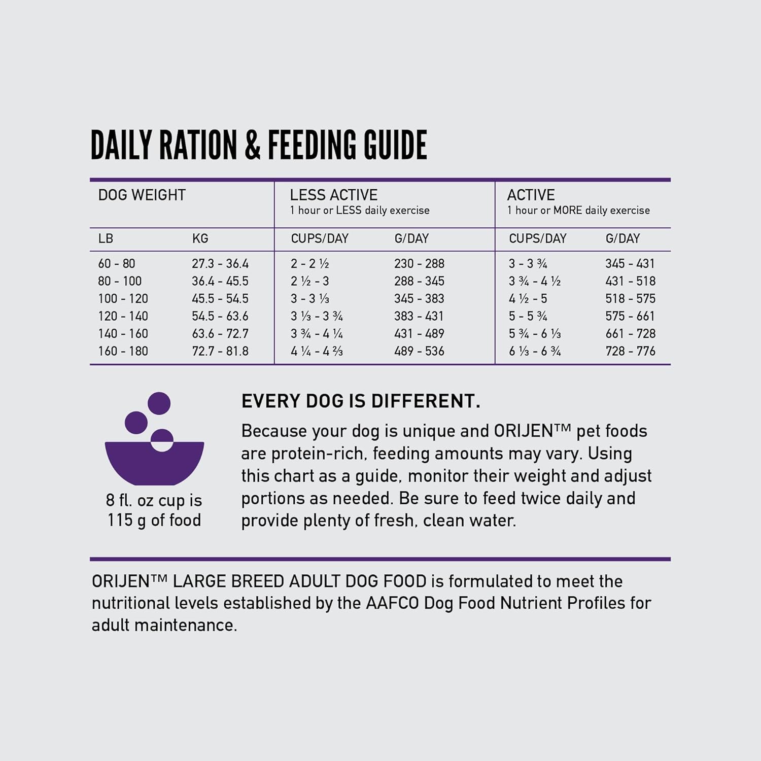 - Directions: Because your dog is unique and ORIJEN pet foods are protein-rich, feeding amounts may vary. Using this chart as a guide, monitor their weight and adjust portions as needed. Be sure to feed twice daily and provide plenty of fresh, clean water. Dog Weight Less Active (cups/day – g/day) Active (cups/day – g/day) 5–15 lb 1/3–3/4 cups – 38–86 g 1/4–2/3 cups – 28–77 g 15–25 lb 3/4–1 1/8 cups – 86–129 g 2/3–1 cup – 77–115 g 25–40 lb 1 1/8–1 1/2 cups – 129–173 g 1–1 1/3 cups – 115–153 g 40–60 lb 1 1/2–2 cups – 173–230 g 1 1/3–1 3/4 cups – 153–201 g 60–80 lb 2–2 5/8 cups – 230–302 g 1 3/4–2 1/3 cups – 201–269 g 80–100 lb 2 5/8–3 cups – 302–345 g 2 1/3–2 3/4 cups – 269–316 g Over 100 lb 3 cups (345 g) + 1/2 cup (58 g) per 20 lb 2 3/4 cups (316 g) + 1/3 cup (38 g) per 20 lb