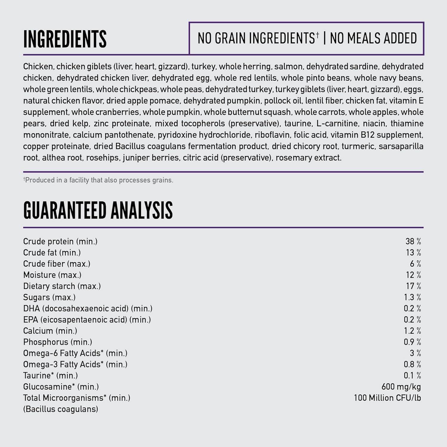 Help your large breed dog thrive with a Biologically Appropriate diet packed with whole animal ingredients. Our ORIJEN™ Large Breed Adult diet is tailored to the unique needs of large breed dogs, and it helps support key health benefits including Joint Health, Skin and Coat Health and Digestive Health. ORIJEN Large Breed Adult dry dog food is crafted with 85%* quality animal ingredients like free-run** chicken and turkey and wild-caught fish to nourish your large breed dog. Packed with WholePrey animal ingredients like organs, this high-protein dry dog food is made with the most nutrient-dense, succulent parts of the prey to deliver the nutrition dogs need. The result is a high-protein diet for your canine companion that is beyond comparison. *Approximate and derived from the unprocessed state of the ingredients. **Our free-run chickens and turkeys are not housed in cages and are able to move in a barn without outdoor access. Our fresh ingredients use refrigeration as the sole method of preservation and our raw ingredients are frozen at their peak freshness.