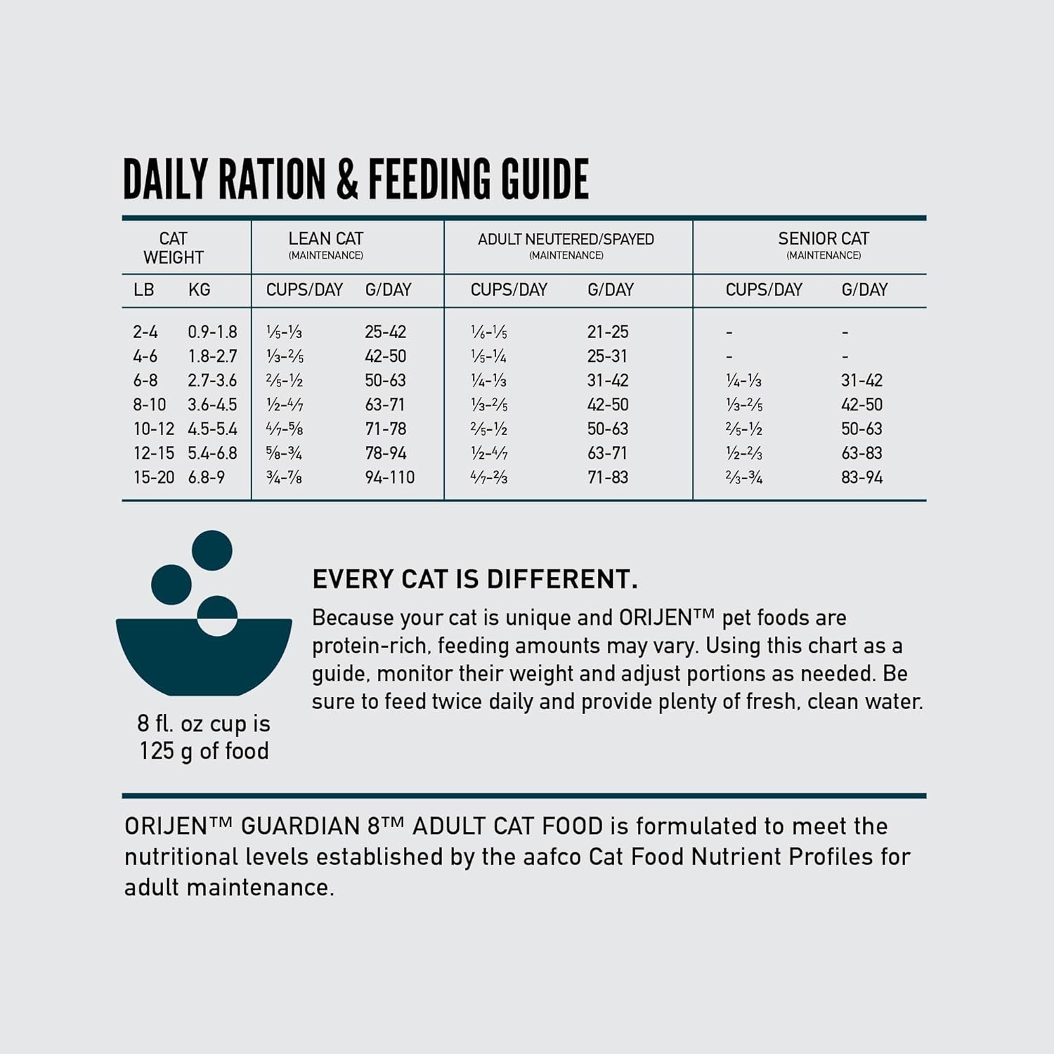 - Directions: Because your cat or kitten is unique and ORIJEN™ pet foods are packed with animal protein, feeding requirements will vary with environment, age and activity. That's why we suggest using the feeding guide as a starting point, and monitoring your cat or kitten's weight and adjusting amounts as needed. We also recommend feeding your cat twice daily and always keeping fresh, clean water available. When switching diets, it's important to transition your cat or kitten as it takes time for their digestive system to adapt to the richer nutrient levels in ORIJEN™. Over a 10-14 day period, gradually mix in ORIJEN™, increasing the amount each day so that by day 14 you are feeding 100% ORIJEN. See your veterinarian regularly. To help maintain freshness, we recommend sealing the bag tightly and storing it in a cool, dry location.