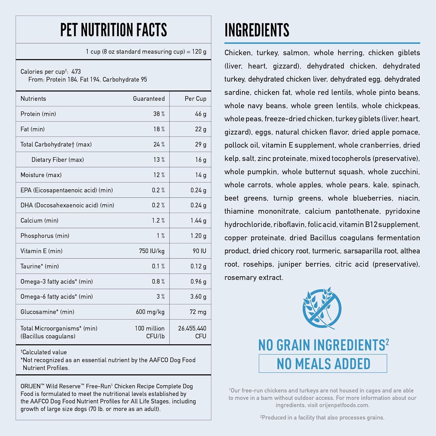 - Breed Recommendation: NUTRITIONAL ADEQUACY STATEMENT ORIJEN Wild Reserve Free-Run Chicken Recipe Complete Dog Food is formulated to meet the nutritional levels established by the AAFCO Dog Food Nutrient Profiles for All Life Stages, including growth of large size dogs (70 lb. or more as an adult).