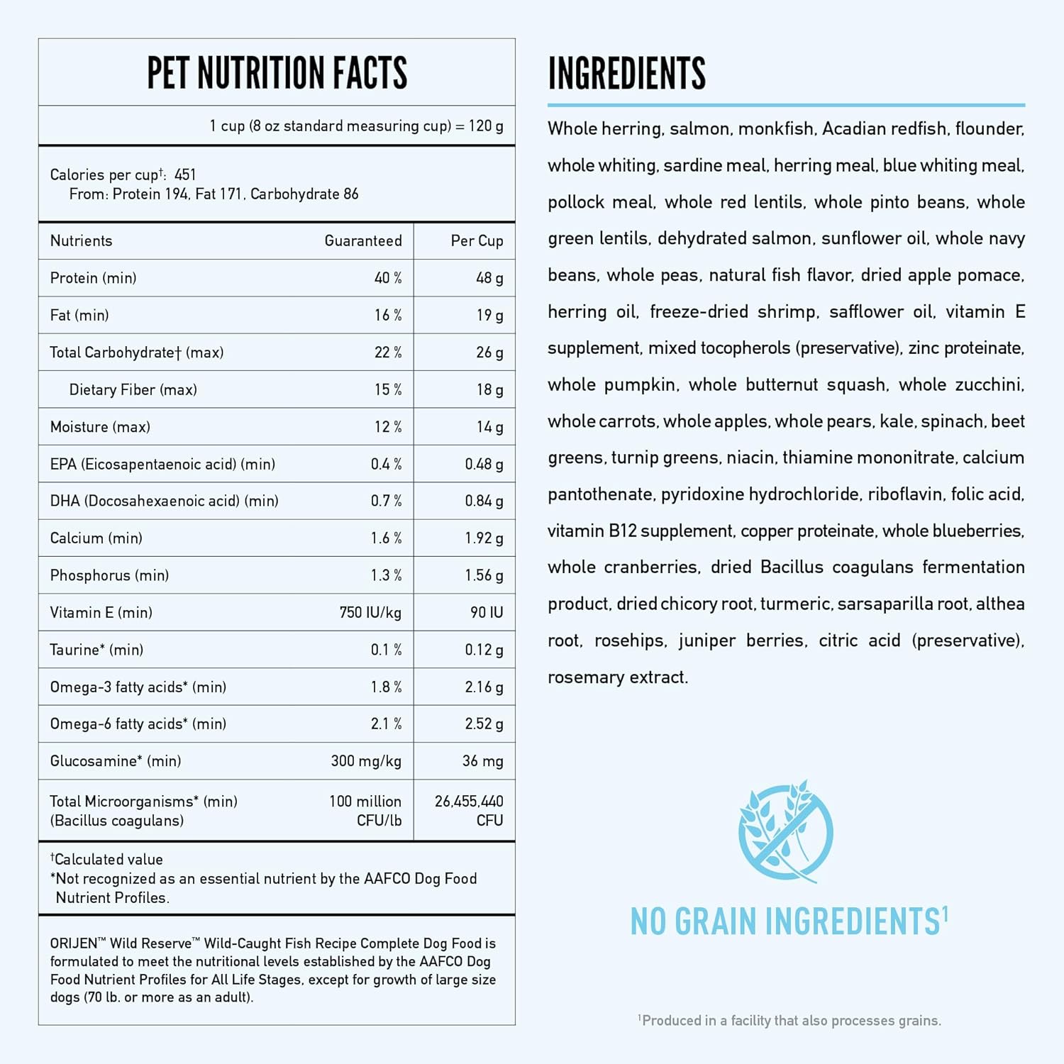- Breed Recommendation: NUTRITIONAL ADEQUACY STATEMENT ORIJEN Wild Reserve Wild-Caught Fish Recipe Complete Dog Food is formulated to meet the nutritional levels established by the AAFCO Dog Food Nutrient Profiles for All Life Stages, except for growth of large size dogs (70 lb. or more as an adult).