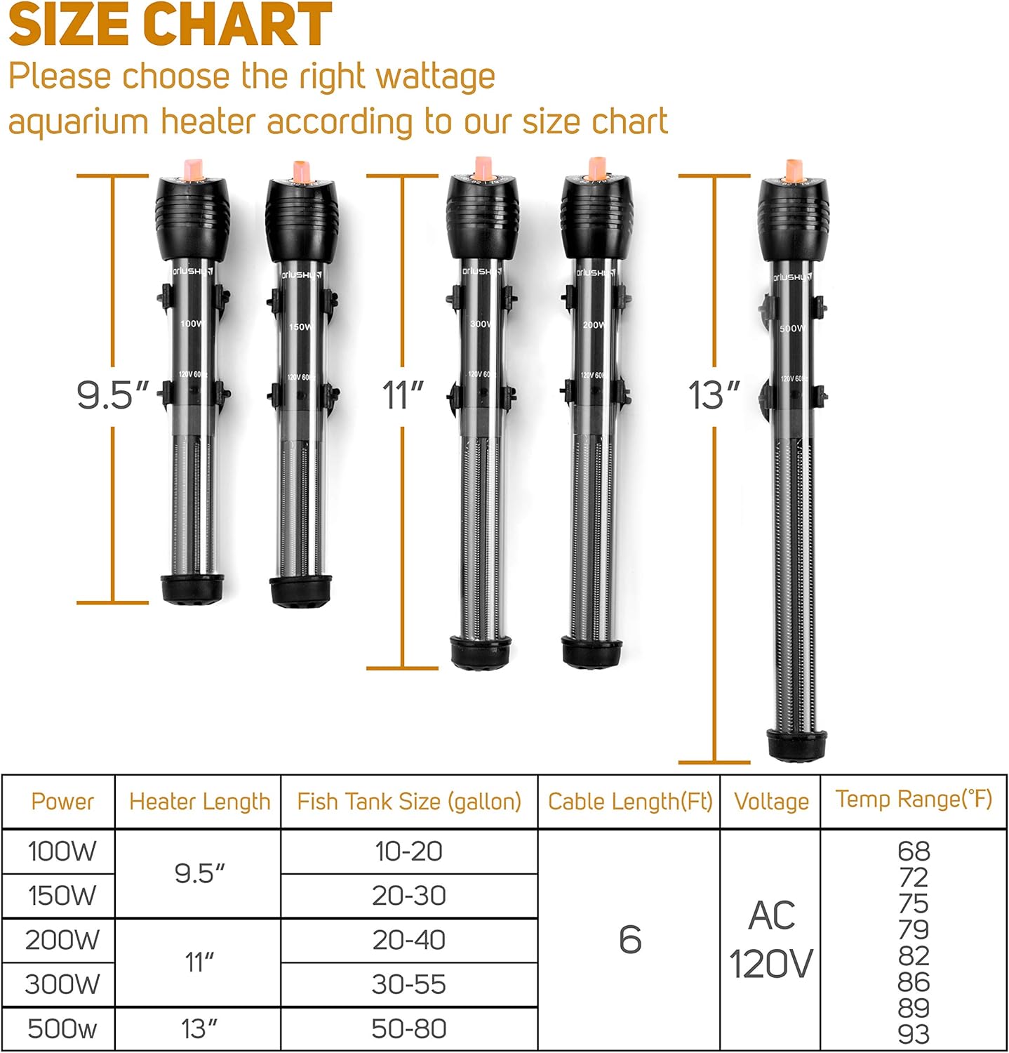 ★300W aquarium heater is suitable for 40 to 55 gallons aquariums,Length - 11 inch,voltage 110-120V, power cord is 6ft, please choose the right wattage aquarium heater according to our size chart. ★It shows an area to adjust the temperature. It's not exactly accurate but it turns easy and can be adjusted at small intervals. ★Explosion Proof: 2mm thickened quartz glass,can be used in fresh water and salt water aquariums,easy to hide in the tank. ★Precise temperature dial from 68 to 89°F allows for complete control of aquatic climate within a 1-degree difference. ★Adjustable Aquarium Fish Tank Water Heater Sensitive and reliable thermostat maintains uniform temperature. Automatic shut off when the temperature is reached › See more product details