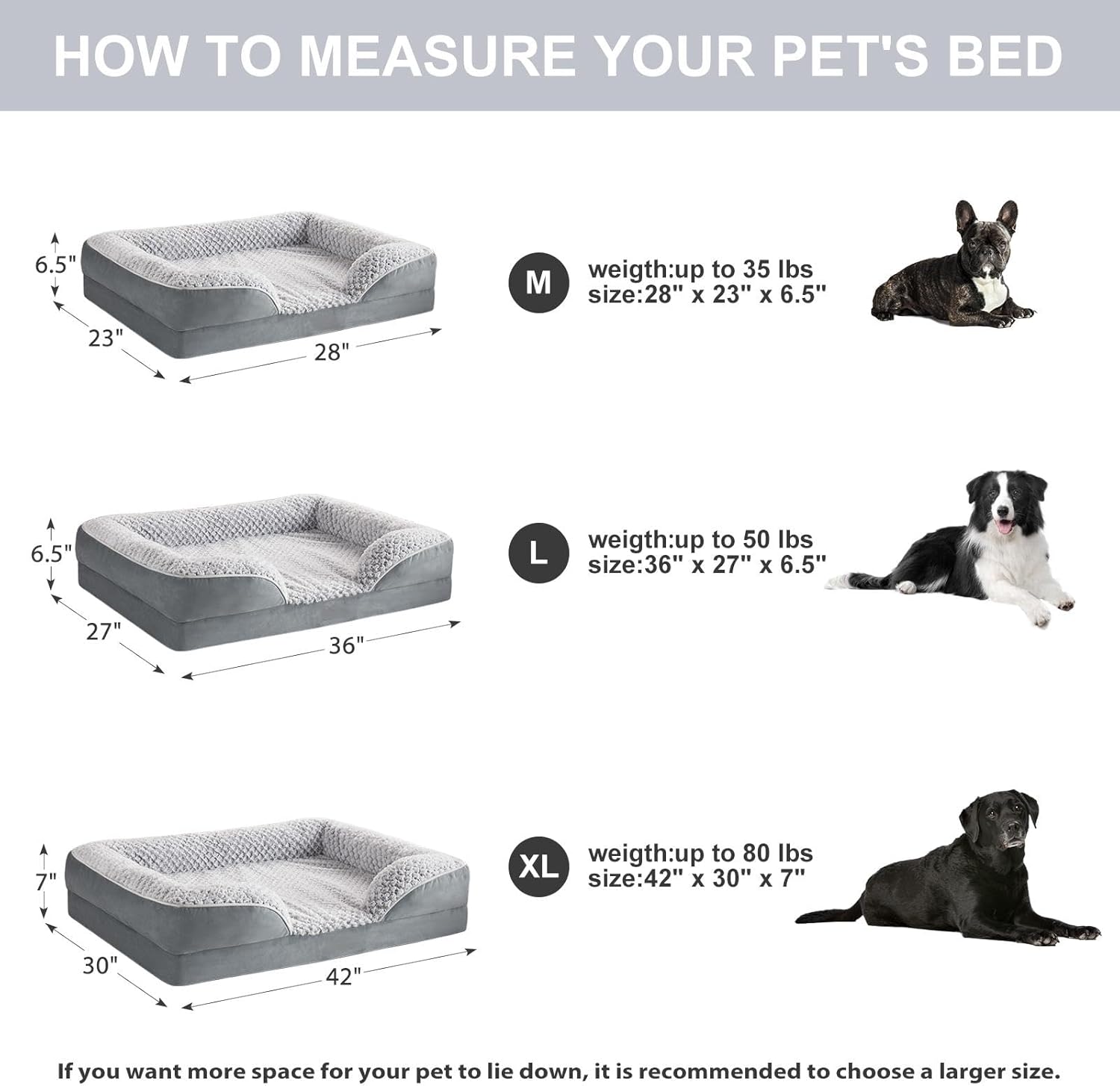 About this item 【Orthopedic Dog Bed】The 4-inch concave and convex egg crate foam orthopedic dog bed has high resilience and high supportability, the large dog bed can evenly support every part of the body, relieve joint pain and arthritis, and maintain the natural curve of the spine so that the muscles are fully relaxed. The dog bed for large dogs non-slip bottom can make the dog sufficient security. 【Dog Sofa Bed】The C-shape large dog bed design mimics the shape of a den or burrow, orthopedic dog couch can help fulfill their natural nesting instincts and reduce anxiety and promote relaxation. The big dog bed provides a cozy and secure space for a dog to curl up and rest. The large dog bed raised edges can serve as a dog pillow, providing support for a dog's head and neck. 【Perfect Size】The dog beds for large dogs measure a generous 36“ x 27" x 6.5"(3.5" bolstered side pillow). The large dog bed provides ample space and comfort for large and medium dogs up to 50 lbs to stretch out and relax. This spacious and cozy dog bed will be the perfect spot for your furry friend to rest and rejuvenate. 【Comfy Surface 】The sleeping surface of the dog sofa bed mainly uses pineapple pattern comfy velvet, the surface of the thick dog bed has full of fluff and fine texture. The washable dog bed cover is very friendly to the dog's skin and the soft dog bed will create a cozy and inviting spot for them to relax and sleep. Your best friend will love to laze around and lay on this sleeping pad all day. 【Easy to Clean】The waterproof dog bed features a removable and washable cover, ensuring the pet bed effortless cleaning and care.The large dog beds with a 3-sided zipper, allowing for easy removal and reattachment. The washable dog bed with a waterproof lining of protection against accidents, keeping the washable dog bed fresh and clean. › See more product details