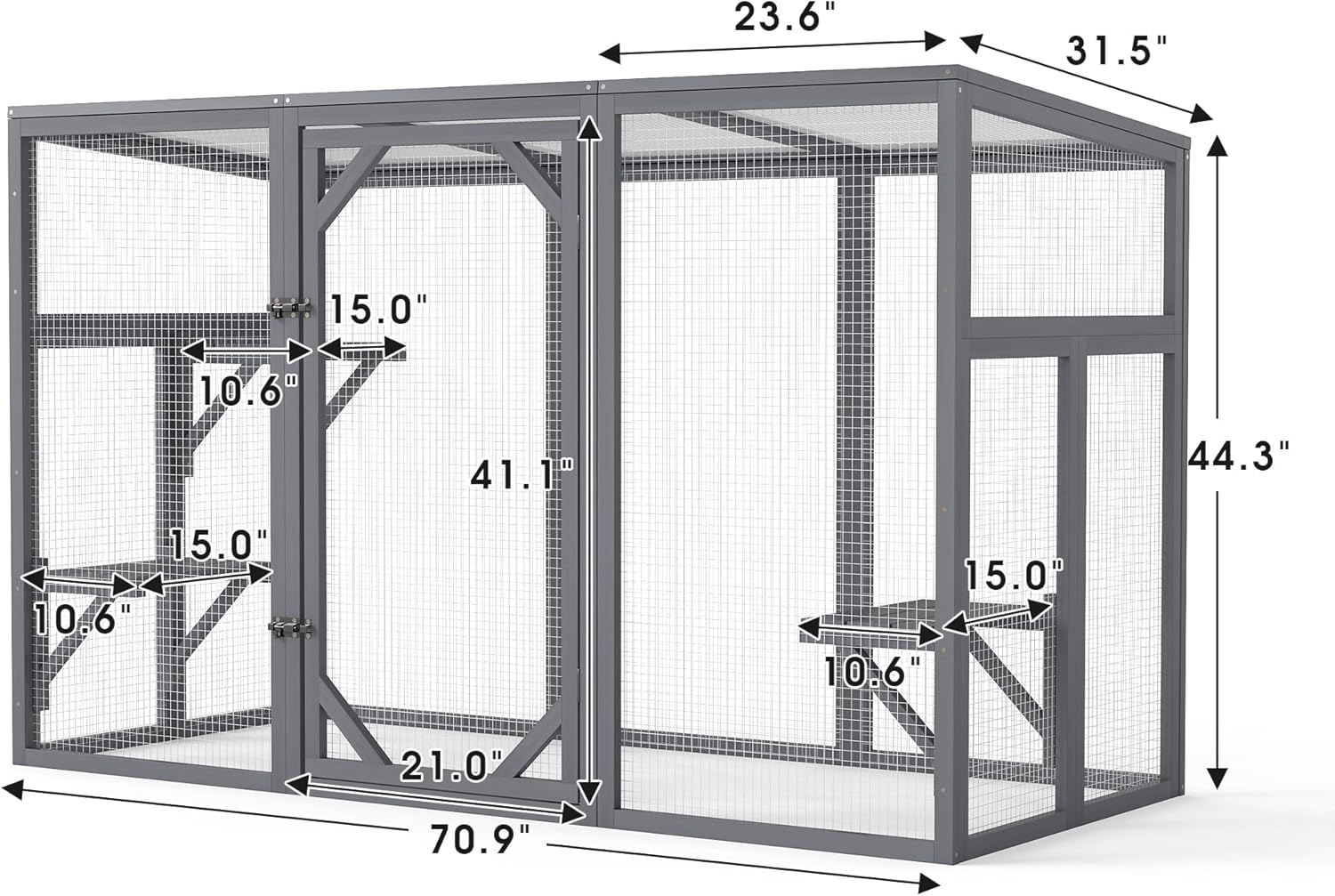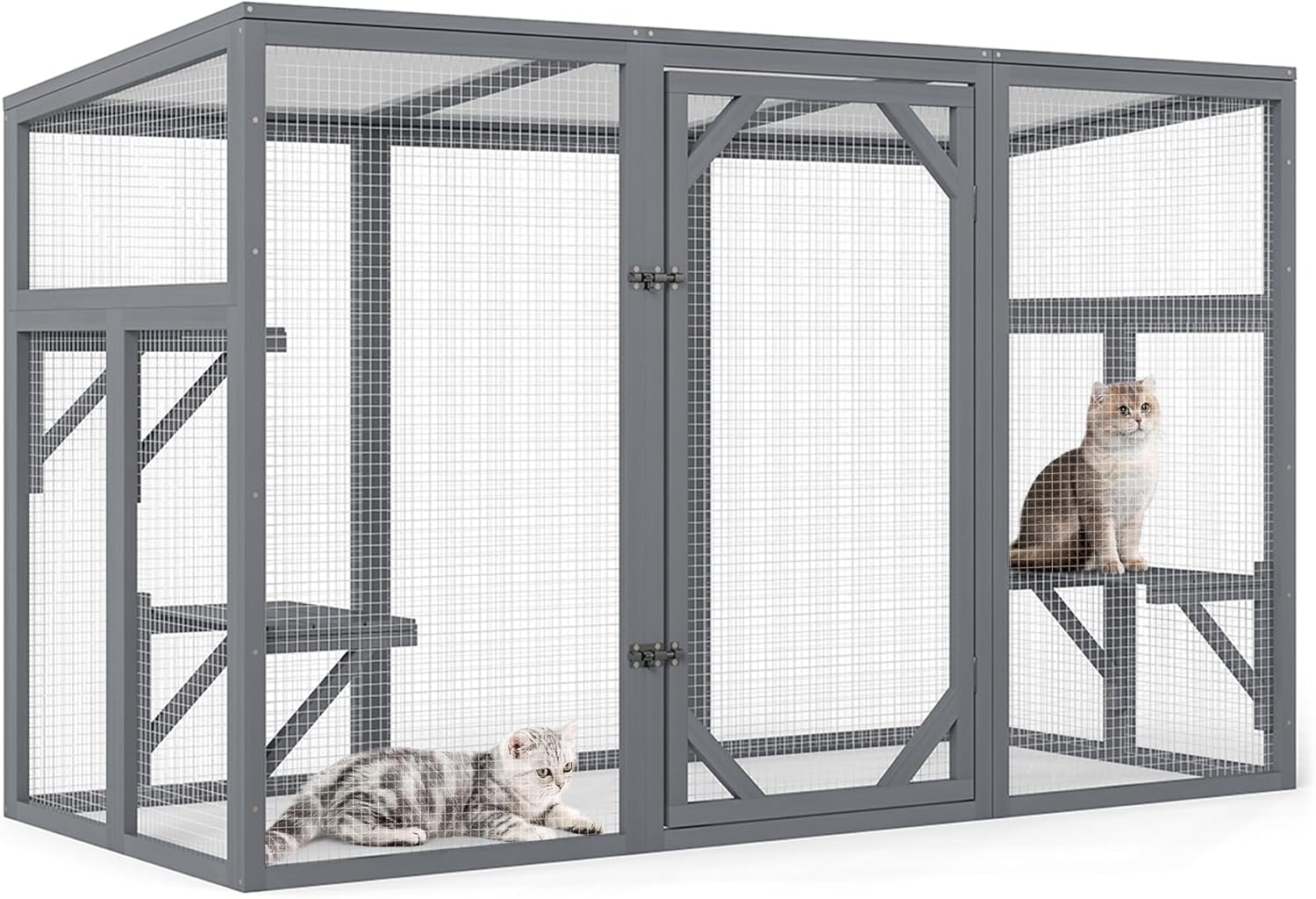 About this item 【Spacious Cat Habitat】: This is a cage specially designed to provide a habitat for cats' outdoor activities. The interior of this cat courtyard features 3 platforms and ample decorative space, allowing your pets to freely move and jump inside. It is the perfect choice for multiple cats. 【Sunlight Absorption and Rain Protection】: The sloping roof allows your cat to be better exposed to the sun, enabling it to lie on the platform and sunbathe. It can also shield the rain brought by rainy and cloudy weather, preventing cats from getting wet. It is suitable for gardens, porches, terraces or yards. 【Sturdy and Durable Wooden Frame】: This sturdy wooden cage is made of solid fir, anti-escape galvanized wire and semi-transparent PC board, providing a rainproof and sunshade shelter for your fur family. Each platform can support a maximum of 22 pounds. 【Convenient and Safe Entry】: The main door is equipped with lockable metal clips, making it convenient for you to enter and exit to clean the cage or interact and play with the cat. The mesh walls around provide the best visibility, allowing you to observe the cat's movements in real time. 【Easy Assembly】: Installing the cat window box is a piece of cake. These platforms can be installed at any height, allowing you to flexibly customize the space to suit your cat's preferences. If you have any questions, please feel free to contact us at any time. We are available 24 hours a day. › See more product details