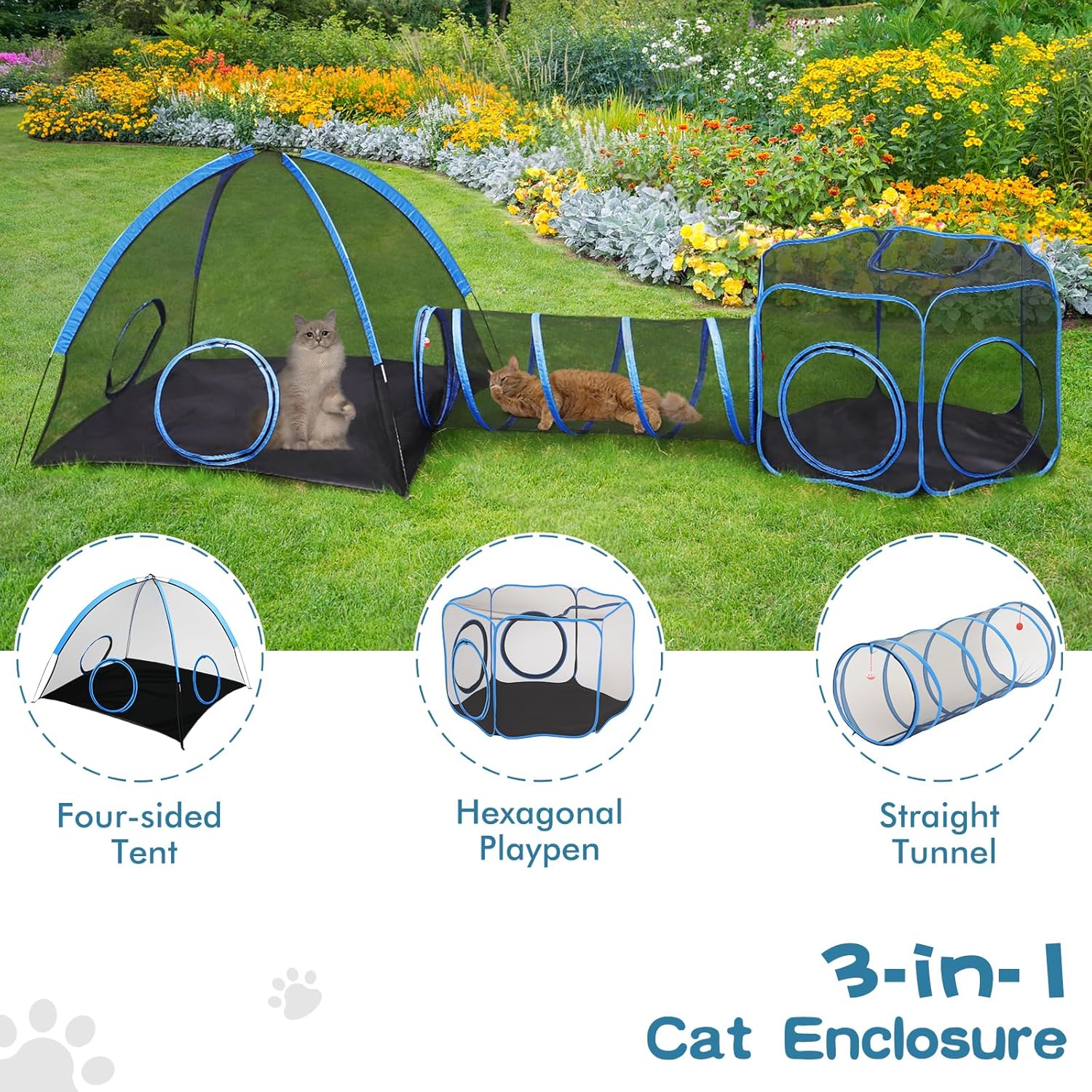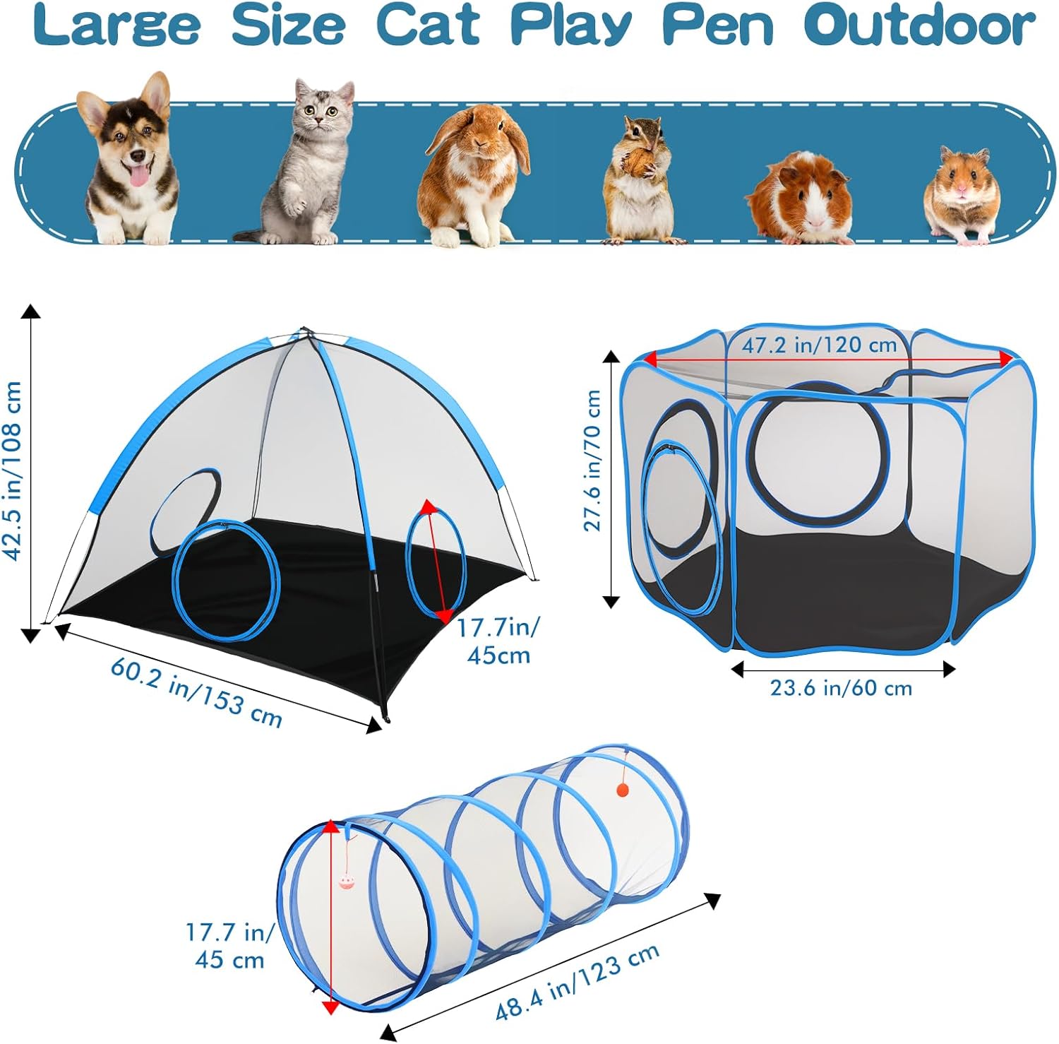 About this item 3-in-1 Outdoor Cat Enclosure: 60" cat tent + 47" hexagon outdoor cat playpen + straight tunnels = instant cat paradise! Let your lovely cat conquer grass, sunbeams, and imaginary jungles safely. More space = more zoomies! Multiple DIY Cat Playpen: The 3 parts of the outdoor catio can be connected by zipper. You can either use them alone or combine them to freely DIY into different shapes to keep your cat fresh, curious and excited. Equipped with a bell and pompom to increase interaction with your cats and prolong their happy playtime. Waterproof and Breathable: The bottom of the cat outdoor enclosure features splash-proof polyester, which is less likely to be stained by pet urine and mud. Surrounded by high-density polyester mesh fabric, it is scratch-resistant and long-lasting. Its good breathability and visibility allows pets to enjoy the scenery of nature without obstacles, and owners can observe pets at any time. Ideal for Indoor and Outdoor: The cat tent outdoor can be used indoors as a cat house, cat maternity ward, or cat nursery to provide a cozy resting place for small pets. With 7 metal windproof nails, you can easily fix the cat tent and enclosure on the outdoor lawn, providing a safe and stable outdoor play place for your pet. Foldable and Portable: Surrounded by steel wires, the cat tunnel outdoor can be easily folded for convenient storage when not in use, and can be used for a long time without deformation. Equipped with a carry bag, you can effortlessly take the portable catio to picnics, camping, travelling and other outdoor activities to use. › See more product details