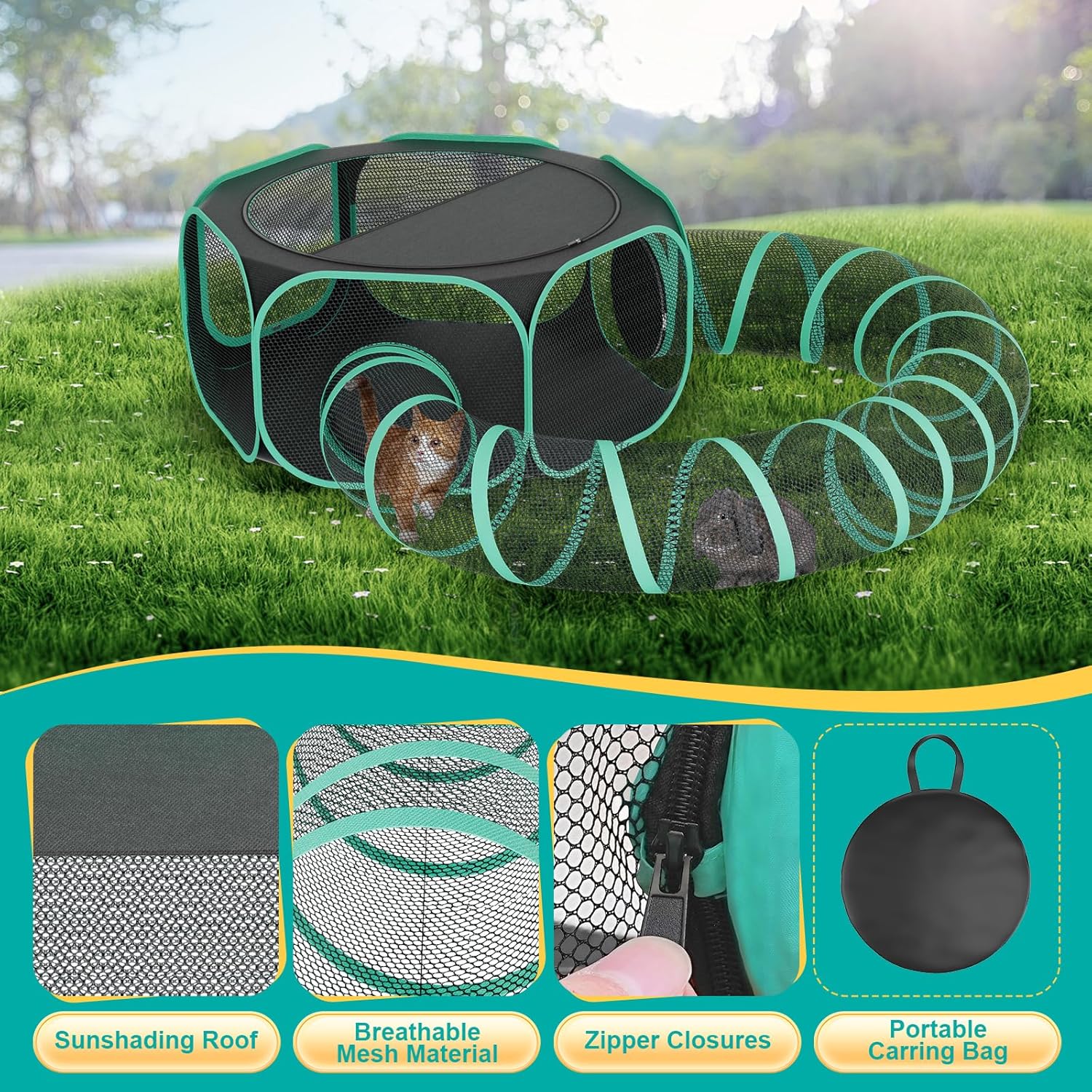 About this item Outdoor Cat Enclosures: Includes one cat tent, one looping tunnel, provide one free straight tunnel. The cat tunnel can link to cat tent by zipper for cats to play. Cat tent and cat tunnels can be used together or separately to create a complete cat playhouse set. Let your pet enjoy the sunny outdoors in this versatile cat outdoor playpen, ensuring their playtime is both joyful and safe. Exceptional Ventilation Structure: Mesh breathability allows your indoor cats to enjoy fresh air without the of risk getting hurt or escaping. This innovative design brings your pets like cats, rabbits, guinea pigs, ferrets, and other small animals closer to nature, let them breathe fresh air, and gives you an easy view of their daily activities inside the cat tent tunnel enclosure. Easy to Store and Carry: The cat tunnel and outdoor cat enclosure can be easily folded into a compact size for convenient storage when not in use. Equipped with a carry bag, you can effortlessly take the cat enclosure to picnics, camping or travel. Its portable design allows you to bring it along wherever you go, ensuring your pet stays entertained whether at home, in the yard, or on the road. Convenient Setup: With these pop-up cat tent enclosures, you can easily set up a playground for your pet in just 1 minute. They are not only super easy to assemble but also ensure hassle-free maintenance. Deluxe and Roomy Pet Enclosures: The cat tent dimensions: 47*47*19inch, the looping tunnel dimensions: 12*122inch, the straight tunnel dimensions: 11*39inch. With over 15 square feet of activity space, this outdoor Pet Mansion is large enough for multiple small animals. To maximize playtime, there is plenty of extra space for toys, treats, litter box. › See more product details