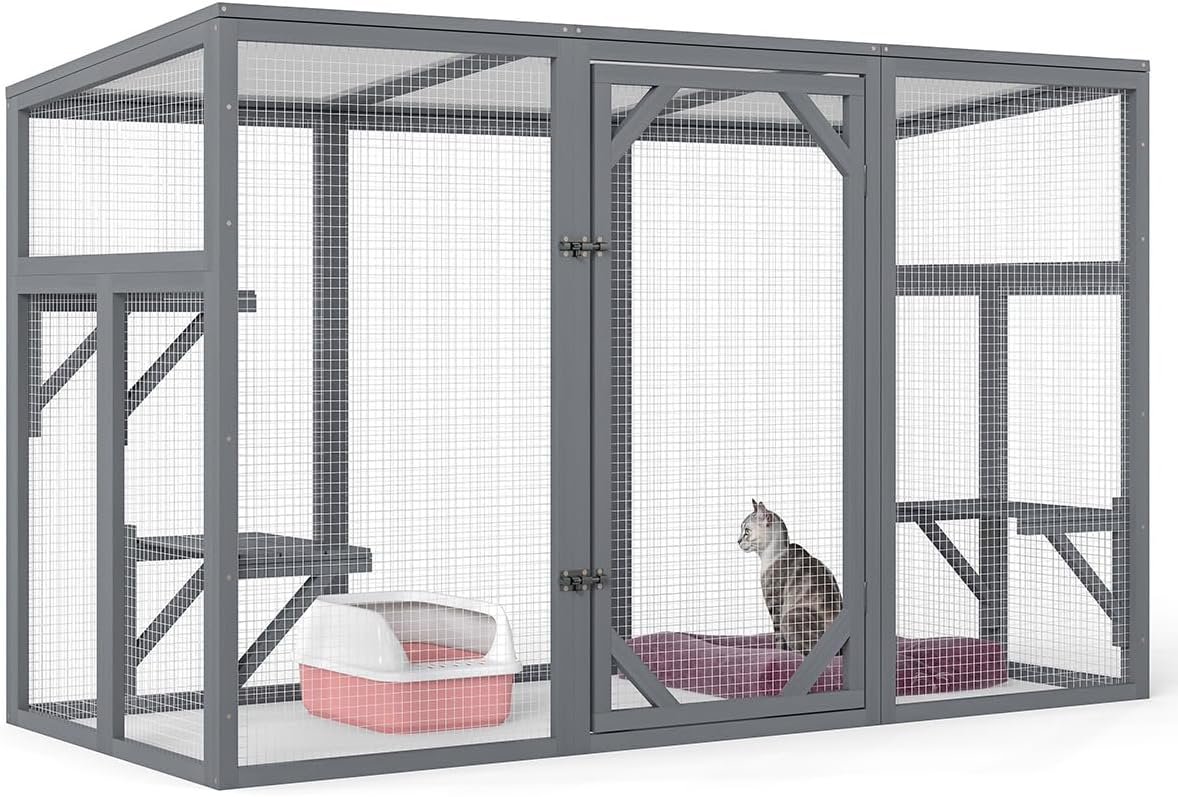 Description: Let your cat safely indulge their natural curiosity with the COZIVVOVV Outdoor Catio. Expertly crafted with solid fir wood and heavy-duty galvanized wire mesh, this weatherproof cat catio provides a secure space for cats to enjoy fresh air while staying protected from rain, sun, and predators. The sloped roof (31.5"L x 24"W) efficiently sheds rainwater, while the reinforced wooden frames (43"L front/back, 29-30"L sides) ensure long-lasting stability. Three adjustable platforms (15"L x 11"W) allow customization for climbing and lounging. Key Features ๐ง๏ธ Weatherproof Protection Roof prevents leaks and UV damage Galvanized Wire Mesh Walls (0.6mm thickness) resist rust and chewing ๐พ Cat-Safe Design Smooth Mesh Edges covered with protective fabric to prevent scratches Locking Front Door (21"W x 41"H) with safety latch ๐ Spacious & Adaptable 71"L x 31.5"W Interior comfortably fits 2-3 cats 22 lbs Platform Capacity supports cats up to 15 lbs each ๐ง Easy Assembly Pre-cut components with labeled slots Requires only a Phillips screwdriver (tools not included) Technical Specifications Color: Gray Materials: Fir Wood + Galvanized Wire Mesh Overall Dimensions: 71" (L) x 31.5" (W) x 44" (H) Front/Back Frames: 43"L x 24"W Side Frames: 29"L x 15"W (Upper) / 30"L x 14.6"W (Lower) Platforms: 15"L x 11"W (3 units, 22 lbs capacity each) Front Door: 21"W x 41"H Net Weight: 50.7 lbs Package Includes Wooden Cat House Step-by-step manual Why Choose This Cat House โ Dual-Use Flexibility โ Works on patios, balconies, or indoors โ Claw-Friendly Build โ Rounded wooden edges prevent snagging โ Expandable Setup โ Add shelves/tunnels via pre-drilled accessory ports Pro Tips Seasonal Care: Apply wood sealant annually to joints Winter Setup: Place heated pads on platforms (fits standard 15"x11" mats) Multi-Cat Layout: Stagger platform heights between 14.6" and 24" for activity zones