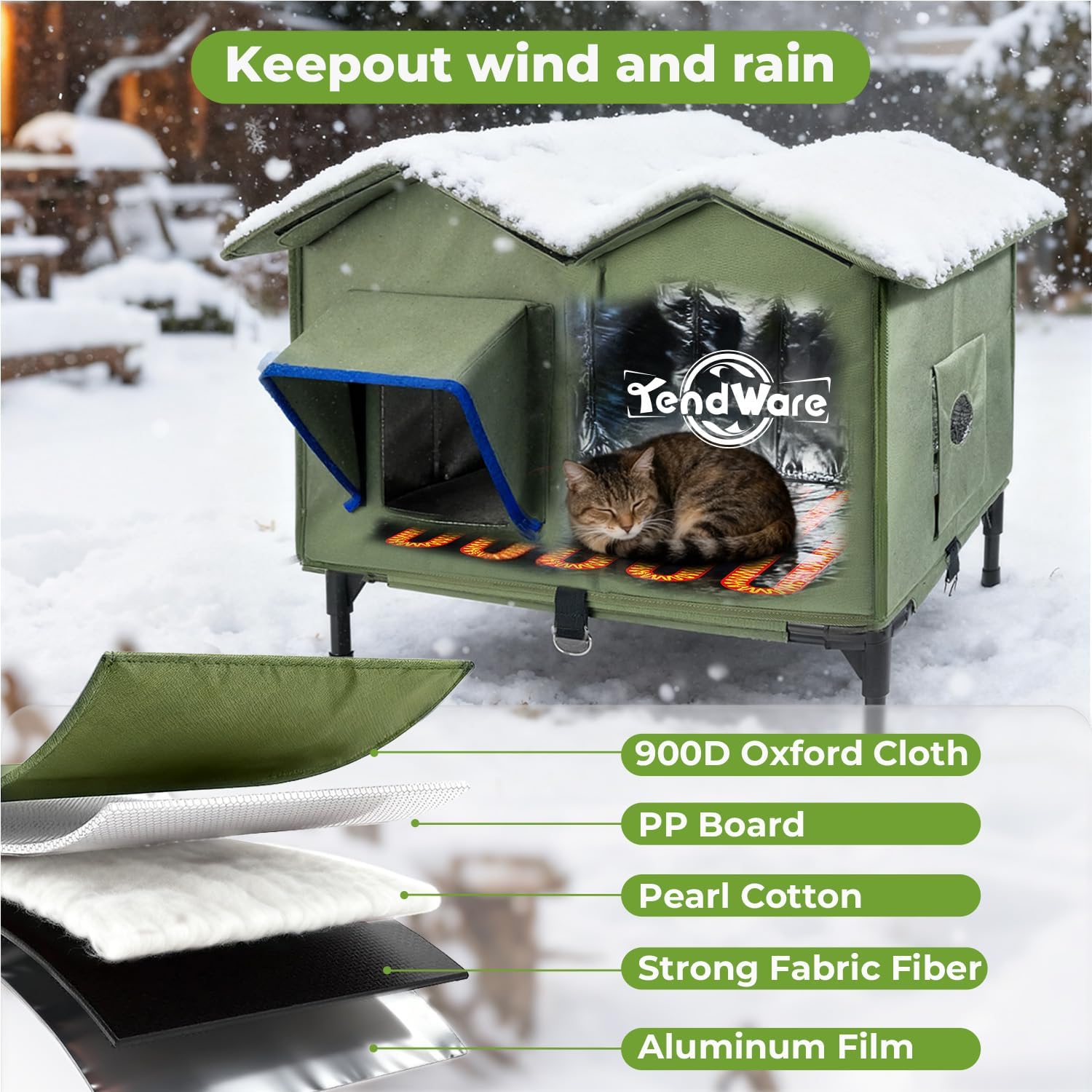 About this item 【Your Kindness Carries Warmth】Our outdoor cat house provide a comfortable heating temperature range of 35~45°C / 95~113°F , weatherproof design ensures that cats stay dry and protected from the elements, ensuring that the cat get warm in winter, giving feral animals,which nowhere to go, a warm corner. *Please note that: Cats have a different perceived temperature threshold than humans, high temperatures can cause them to lose hair. 【Safe and Windproof】 With two exits the cat can freely exit from anywhere within this heated cat house. The magnetic door only can as exit allows cats to escape easily while keeping predators out, thus preventing attacks and ensuring the safety of stray cats. Additionally, this door features a clear peep window to satisfy cat's curiosity. Heated cat house for outside features D-shaped fixed hole on the side, along with two nails to secure it and prevent it from being blown away by the wind. 【Prevent Moisture and Stay Dry】 Tendware Cat houses for outdoor is constructed of waterproof fabric such 900D oxford cloth, PP board,pearl cotton, aluminum film, keep warm and weatherproof. The sides of our heated cat house for outside are stitched together, no risk of water seepage. Unlike other cat houses that use Velcro splicing. The bottom is equipped with elevated base to prevent the bottom water from seeping into the house. And waterproof cord outlet can also avoid water leakage. 【Unique and Practical Design】 This heated cat house with a triangular waterproof roof can give the cat more space, and is easy to open to clean. Not only that, to attract the attention of feral cats, we set the blue to edge of waterproof eaves in entrance. Blue and green are the colors that cats can perceive most intensely. At the same time, we provide two kinds of door flaps, transparent door flaps and the Oxford cloth door flaps for enhanced wind protection and thermal insulation performance. 【Easy Assembly and Portability】 Setting up the heating cat house for outdoor cats is quick , with no tools required. Only need to follow the easy instructions of cat house outdoor to finish the installation. It easy to move relocate as needed,whether you're setting it up indoors, on a porch,in the yard or in a garage. › See more product details