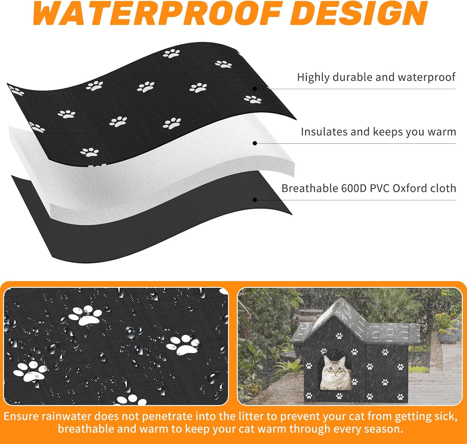 About this item Large Outdoor Cat House: Comfortable cat house, Perfect for outdoor cats and small dogs that sleep In garages, porches, barns, or even in the house. Easy to Assemble: The cat houses for outdoor cats can be easily disassembled and installed in seconds without tools, put in the removable and comfortable pet mat which is attached by silky smooth zipper. Foldable and carrying handle design, easy for you to move and store for out door cat shelter. Waterproof and Stable: Our outdoor/indoor cats house is made of multi-layer thickened waterproof oxford fabric material, which is effective in waterproofing and insulating to meet stray cats' needs for hiding and scratching play. Equipped with 3 grounding plugs to ensure that the outside cat house is stable and not easily blown away by the wind, providing a reliable shelter for stray cats. DIY Design Cat House: The cat house outdoor is designed with waterproof and windproof side door curtains and thresholds to protect pets from winter or rainy days. Innovative DIY cardboard design prevents the outside cat house for winter from being misplaced or discarded. Wide Application: Our outdoor cat house is perfect for both indoor and outdoor use. Whether you want to provide stray cats with a comfortable outdoor space or simply need a cozy place for them to rest in your garage or workshop, our cat house is a perfect choice. › See more product details