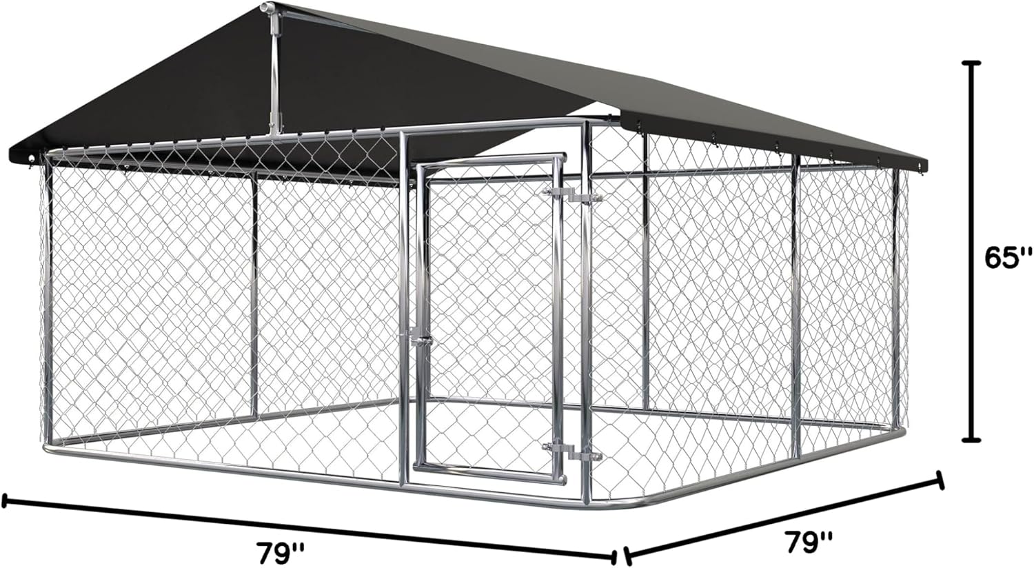 About this item 【Heavy-Duty Design】Our dog cages are constructed from thicker galvanized metal and high-quality steel wire mesh, ensuring rust-proof durability. Additional ground stakes securely anchor the cage for enhanced stability. 【Spacious Play Area】Dimensions: 79”W x 79”D x 65”H. This outdoor dog kennel is ideal for small and medium-sized dogs, providing a perfect space for training, resting, and playing outdoors. 【Rain & UV-Proof Roof Cover】The roof cover is made of high-quality PE fabric, protecting against rain, dust, UV rays, and light snow, making it suitable for year-round use. (We recommend removing the cover during heavy snowfall.) 【Easy Installation】This is a DIY kit that comes fully unassembled. Two people can complete the assembly in about 1 hour. Detailed instructions, accessories, and gloves are included for your convenience. 【Outdoor Play】A canopy is added above the kennel, allowing your pet to enjoy the outdoors, whether it's a hot sunny day or rainy weather. › See more product details