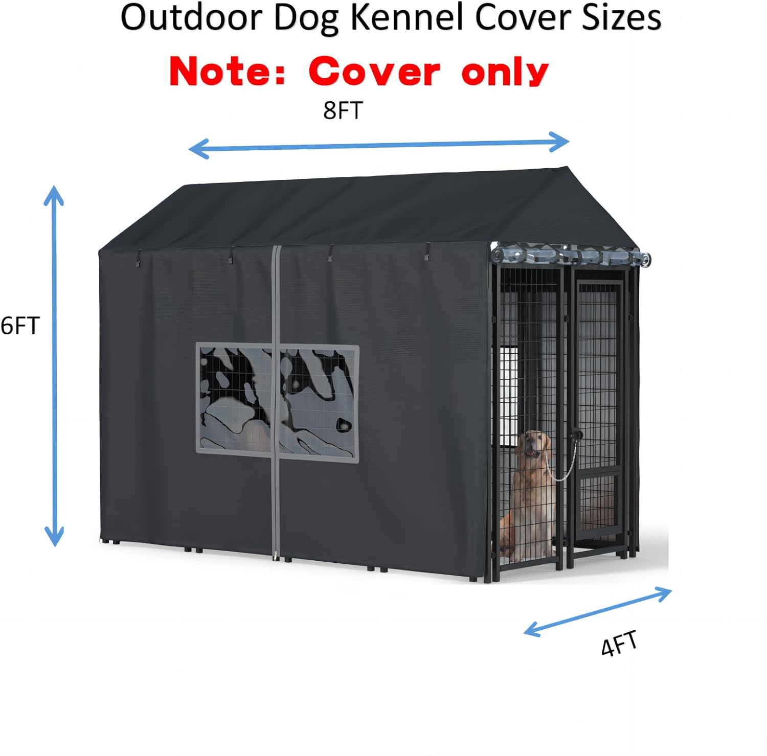 About this item 【Outdoor Dog Kennel Cover】 - Measures 8'Dx4'Wx6'H. Fits most brands of dog kennels. Please note: Cover only kennel not included. 【WATERPROOF AND COLD RESISTANT COVER】 - Our dog kennel cover is made of 600D durable oxford fabric with waterproof PU coating, which is waterproof, cold-proof, UV-resistant and tear-resistant. No more need to let your pet shiver in the winter cold wind.The doghouse cover is very easy to install. Simply open the zipper and cover the doghouse directly, then use the ball-headed fastening rope provided to secure it to the doghouse through the metal holes. 【EASY TO USE】 - Large Outdoor kennel cover has 6 zippers on the side, each side can be rolled up and secured with the top Velcro so you can interact with your pet without removing the cover. Our kennel cover has been upgraded with metal rings on the sides and a ball-end elastic cord to better secure the kennel cover to the kennel and prevent it from blowing away in the wind. 【Humanized Design】- Zipper is added in the middle of both sides of the large dog kennel cover. In winter, it is a fully covered dog kennel cover, which is beneficial for wind and cold prevention. In summer, it can be turned into a semi covered one, which is beneficial for ventilation, sun shading, and rain prevention. Our dog kennel cover can provide a comfortable environment for your dog all year round. 【Perfectly Suitable for Dogs】 - Don't let your pets exposed to sun, wind, rain and snow for a long time. In this way, they are easy to get sick. Our full-coverage kennel provides full protection for your pet and kennel. Prevent them from being harmed by weather conditions. 【GOOD LIGHTING EFFECT】Our outdoor kennel cover front door and windows on both sides are made of transparent pvc material with good lighting effect, your pet will not feel uncomfortable in the cold winter when the kennel cover is fully covered, and it also allows you to know what's going on inside the kennel without lifting the cover. 【Good Shopping Experience】- One year warranty, if you have any questions about our outdoor dog kennel cover, please contact us, we are happy to help you, we want our customers to be 100% satisfied. Note: Kennel cover only does not include dog enclosure.due to the large size of the dog kennel cover, we recommend installation by at least two adults working together. Installation is straightforward and requires no additional tools. Simply unzip the cover and place it over the dog kennel, then secure it to the bed using the provided bungee cords with ball ends through two adjacent metal eyelets. › See more product details