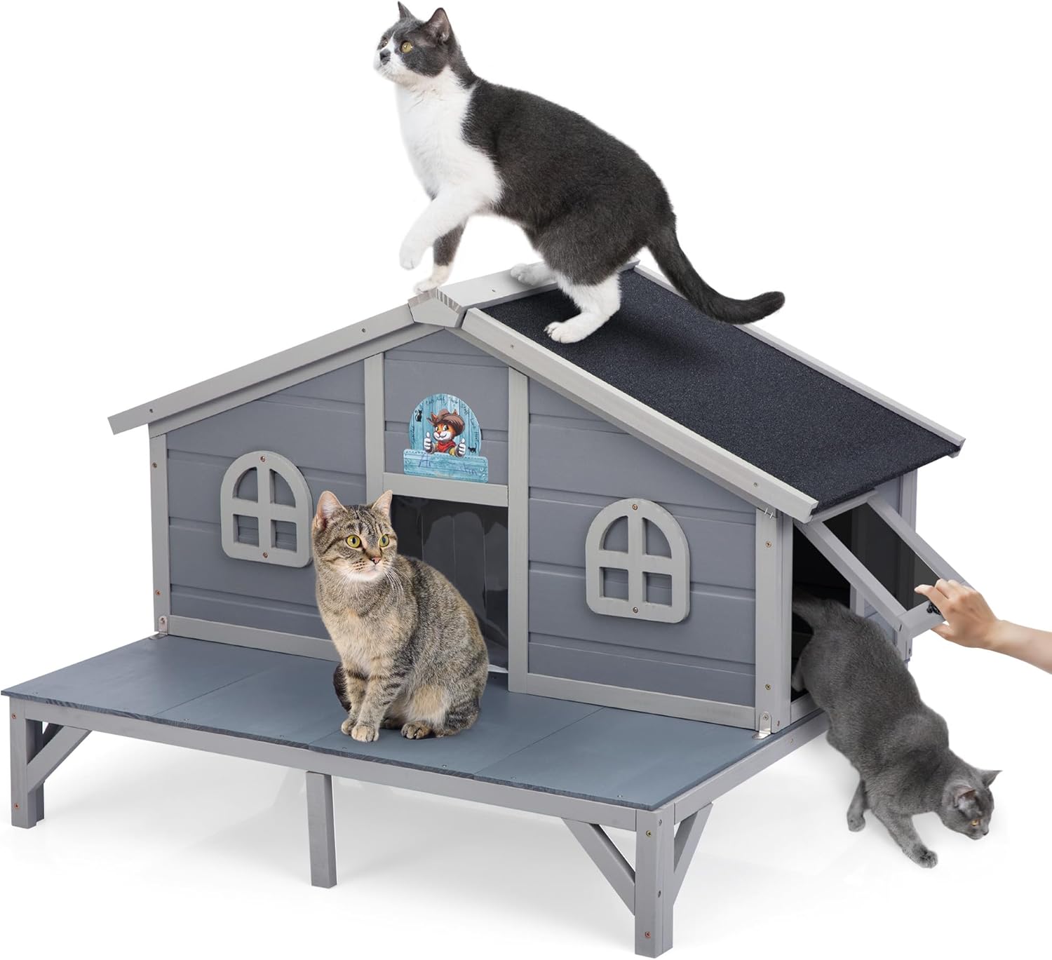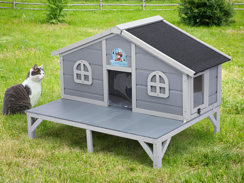 About this item 【Large Space】Our outdoor cat house offers a roomy 4.74 sq.ft. interior, perfect for 2-3 cats under 15 lbs, puppies, rabbits or other small animals to rest and relax. complemented by a 3.77 sq.ft. outside open lounging deck that allows your pets to bask in the sun, feed, interat, and access easier 【Weatherproof】Our feral cat house is built with nature wood with a waterproof coating, and the top roof with widen eaves is sloped to keep water away. The elevated base offering your pet a dry space that can keep away from moisture. Ideal for Indoors & outdoors 【Safe & Cozy Home】Designed with a closed structure, the outdoor feral cat house give a cozy privacy space for small animals to play and hide, and aslo protects cats from bad weather or predators 【2 Escape Doors】 The front door features flexible thickened PVC flaps, keeping away from rain and wind. The lockable side door also provides cats a safe entry while helping to retain warmth, clean and feed 【Aesthetic & Practical】With a pretty appearance, our wooden cat house is a charming addition enhances the aesthetic appeal of your garden and home. Comes with a reusable acrylic board, you can You can even write your pet's name on it, adding a personalized flair that makes it uniquely theirs! › See more product details