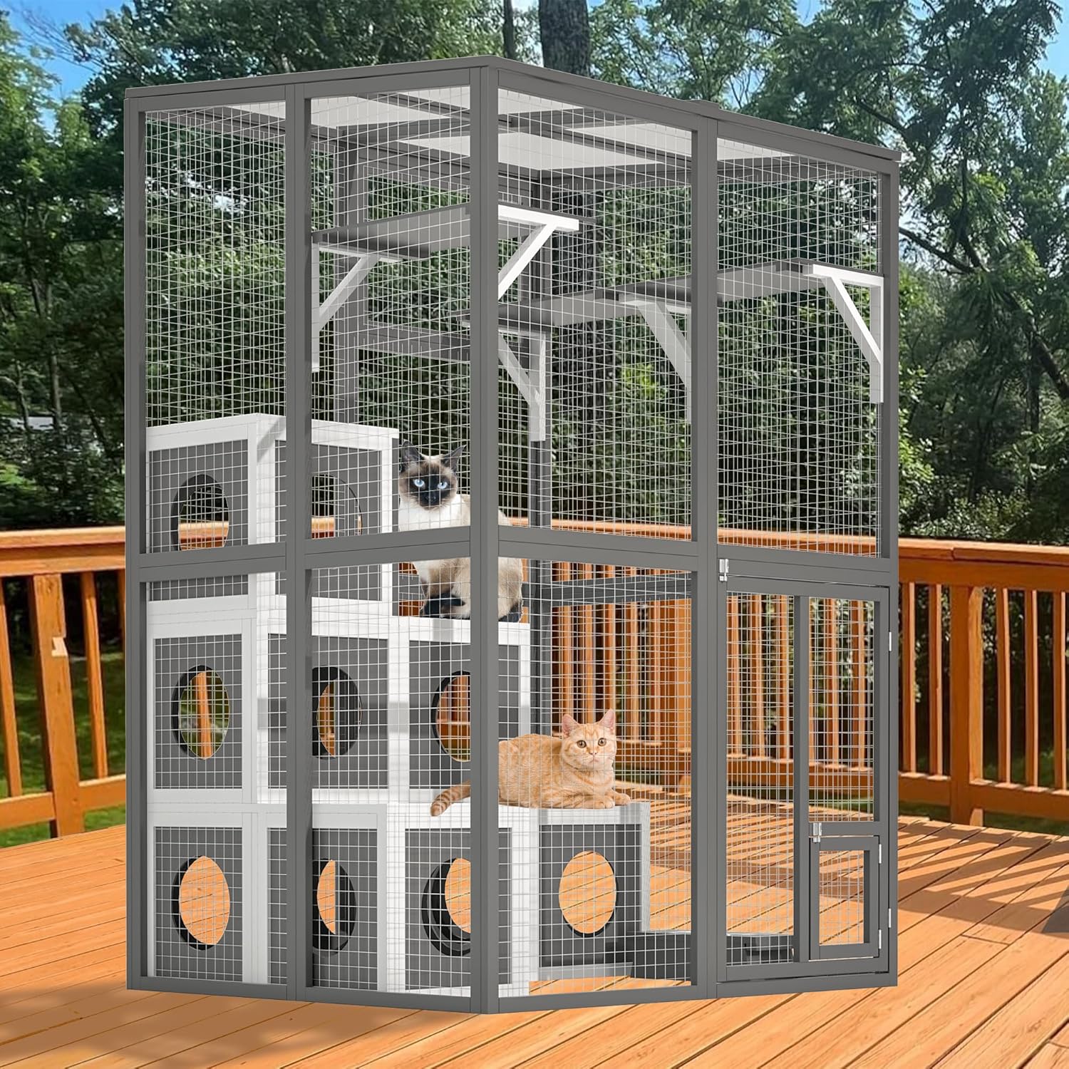24/15 Customer Support: Our team is always ready to assist youManufacturer Contact: amazonvendorfeedback@gdfstudio.zendesk.comThis extra-large wooden catio provides a safe outdoor haven with 2 jumping platforms, 7 napping spots, and a walk-in design—perfect for multiple cats! Built with solid fir wood and strong wire mesh, it resists weather and predators. The removable mesh panel allows window attachment for indoor-outdoor freedom, while the weatherproof roof ensures year-round use. Durable, spacious, and versatile, it’s the ultimate playground for happy, active cats!