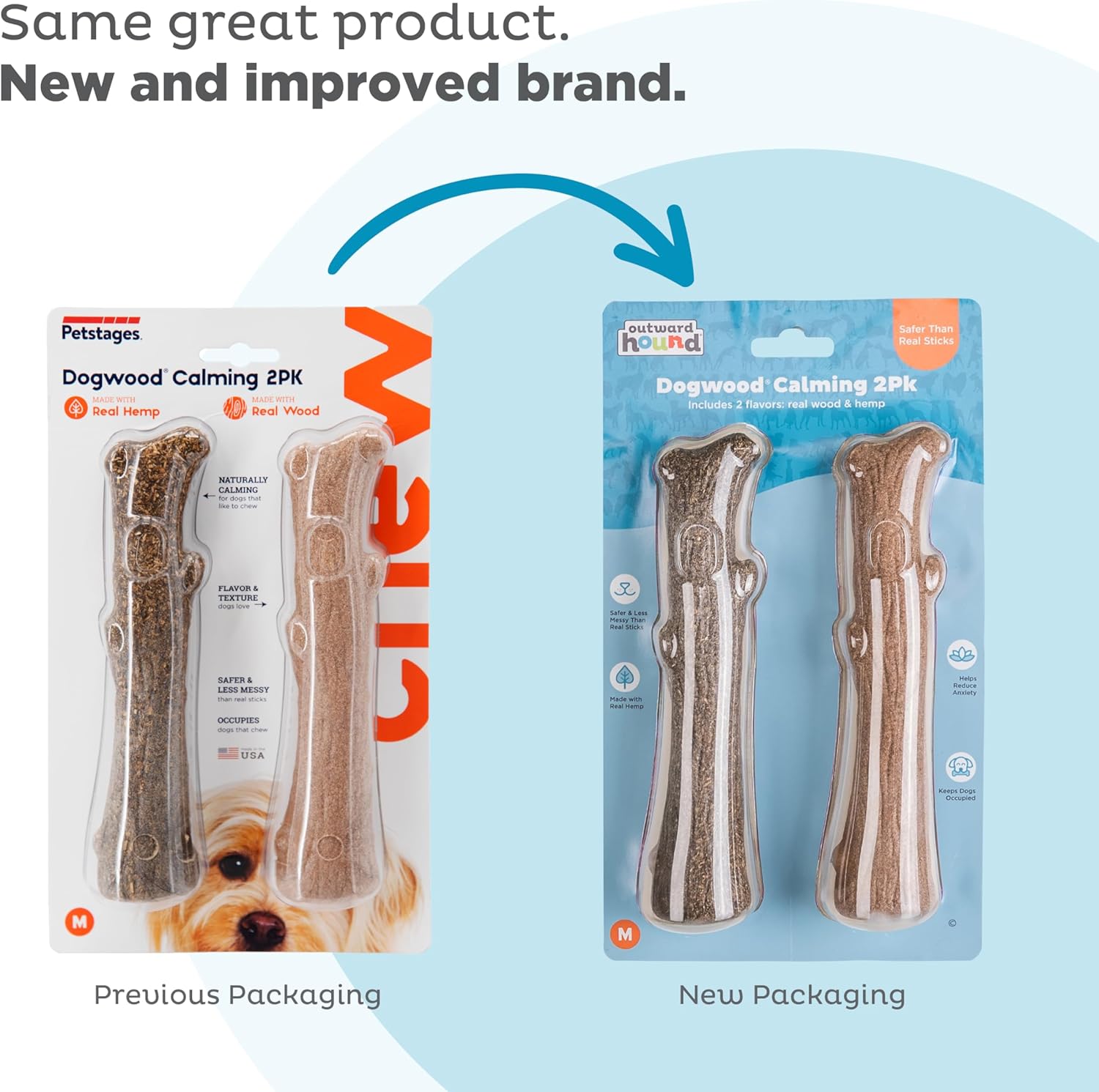 A safer alternative to chewing real wood sticks, Outward Hound's Dogwood product line has all the taste and texture of a natural tree branch but will last much longer for your beloved pup! Made in the U.S.A. to ensure quality and care, these dog toys for aggressive chewers bring real wood to your dog's favorite durable chew toy to help keep them busy and entertained for long-lasting fun. Real wood and calming hemp scents can help calm anxiety while your dog works out their instinctual chewing behavior. Available in multiple sizes and scents, single packs to two-packs, there's a Dogwood chew toy for every dog, whether a puppy, small dog, medium dog, or large dog. Dogwood alternative wood chew stick varieties are also great for outdoor chew time and come in calming hemp, fresh breath mint, and even TPE versions for teething puppies! Enjoy the durability, less mess, and chew satisfaction of the Dogwood by Outward Hound. SAFETY & CARE: Alternative chews are non-edible and are meant for dogs only. As with any chew toy, we always recommend monitoring your dog's use and replacing after reasonable wear, no toy is indestructible. Remove if chew toy is less than half of its original size or pieces larger than a piece of rice are chewed off. Know your dog’s chewing habits and teeth strength, your pet’s safety is your responsibility. For additional safety information, please visit outwardhound.com/safety to review our suggested 10 Chew Commandments.