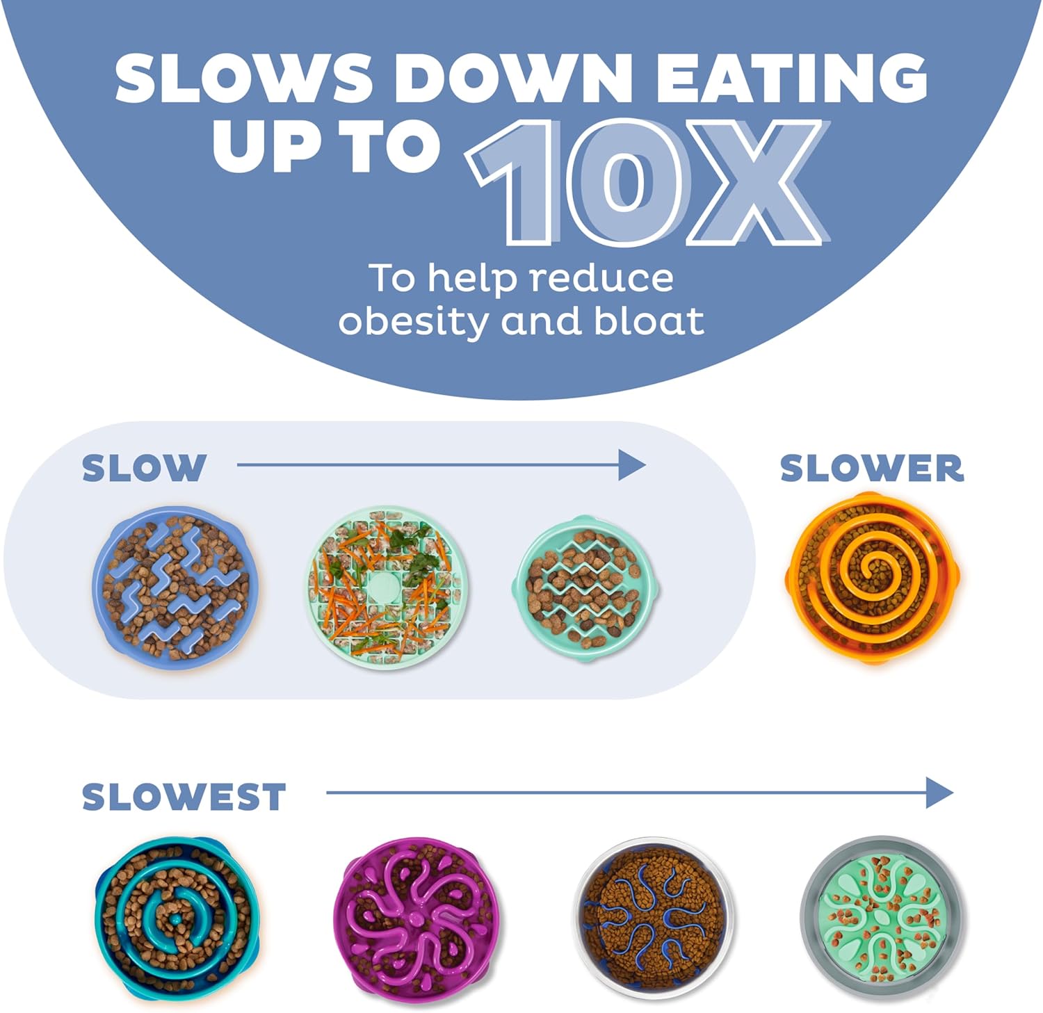 Why do dogs feel like eating is a race? We're not sure, but we solved the problem anyway. With meal-lengthening ridges, deep grooves, and challenging mazes, Outward Hound Fun Feeder Slo Bowls keep dogs engaged for up to 10x longer at chow time. By creating a fun, healthy eating pace, our slow feeders help reduce obesity and bloat and improve your dog's digestion for happier, healthier pups. Available in multiple colors, sizes, and slow levels – Slow, Slower, Slowest – including a slow bowl for flat-faced breeds, there's an option for your unique dog and their eating speed. Our slow feeders are non-slip to prevent sliding and spillage, top rack dishwasher safe, BPA, PVC, lead, and phthalate free, and available in small (3/4 cups), medium (2 cups), and large (4 cups) to hold an entire meal no matter your dog's size. Go beyond the boring ol' dog bowl, and make mealtime more fun!
