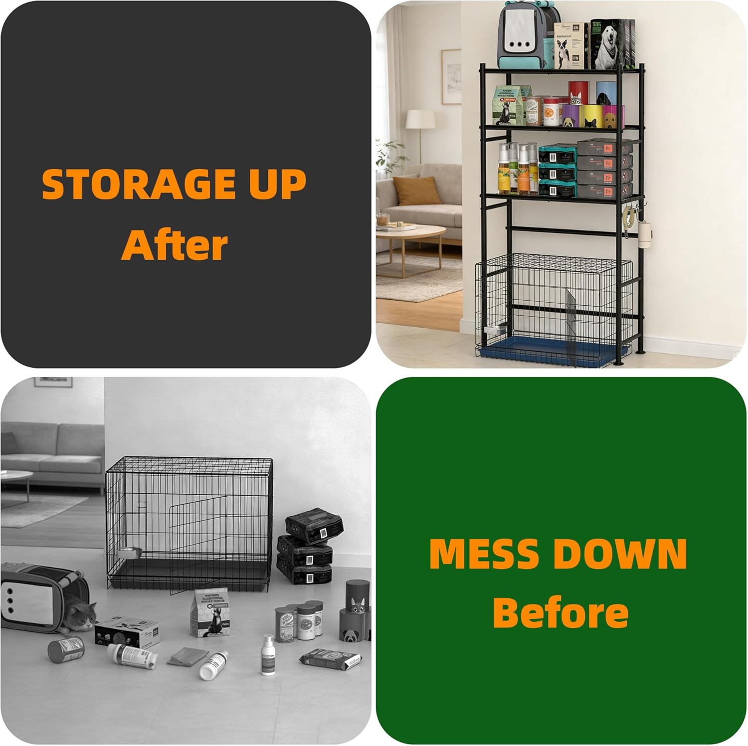 About this item 【Heavy Duty Carbon Steel & Rust Resistant】Made of high-quality carbon steel, supports up to 60LBS per shelf(Total 180LBS), anti-rust and anti-deformation, perfect for storing large bags of dog food, pet bowls, and toys. 【Space-Saving Over-Crate Design】32.28"W fits most breed sizes dog crates, utilizes vertical space above the crate, keeps pet supplies organized without taking up floor space—ideal for apartments and small homes. 【Adjustable Feet for Stability】Non-slip adjustable feet adapt to uneven floors, preventing shaking even when storing heavy items. Easy to level and install without drilling. 【3-Tier Large Capacity Storage】3 layers of storage space for classifying dog food, snacks, toys, leashes, and grooming supplies—keeps your pet area tidy and organized. 【Wide Applications】This storage rack can be used not only as a storage rack above the dog crate to increase space, but also as a organizer shelf in the kitchen, living room, office. › See more product details