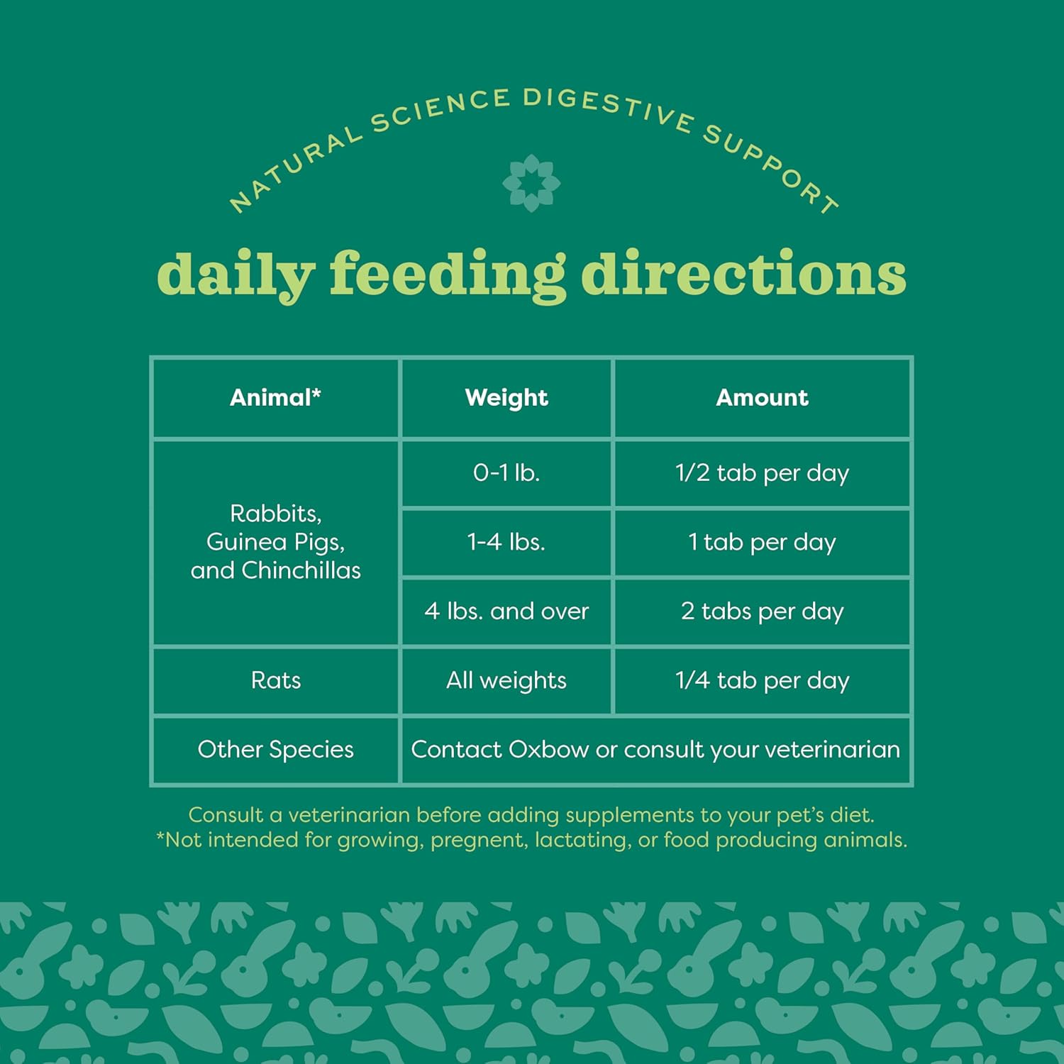 - Care Instructions: Rabbits, Guinea Pigs, and Chinchillas 0-1 lb 1/2 tab per day 1-4 lb 1 tab per day 4 lb & over 2 tabs per day Rats (all weights) 1/4 tab per day Other Species Contact Oxbow or consult your veterinarian *Not intended for growing, pregnant, lactating or food producing animals.