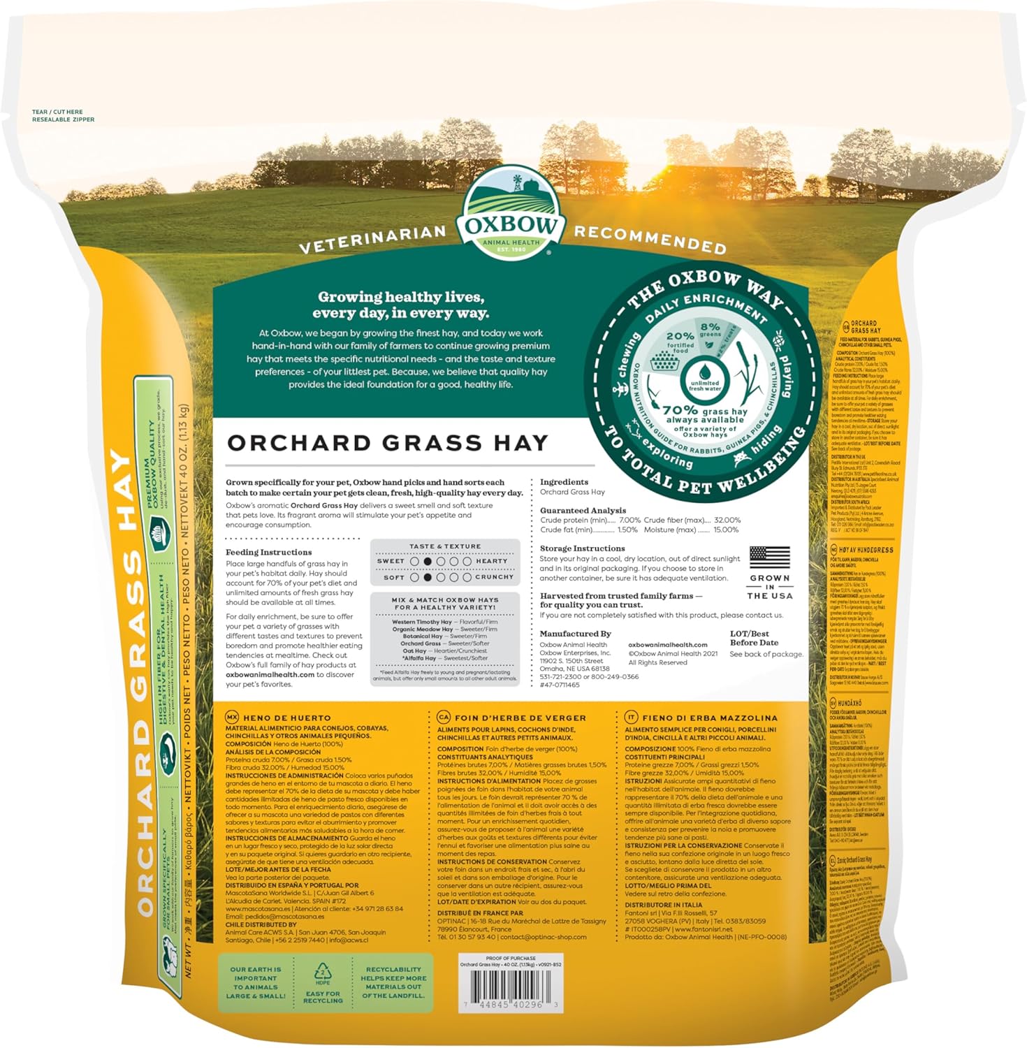 Oxbow Animal Health Orchard Grass Hay is a premium all-natural grass hay specifically cultivated to support the digestive health and overall well-being of small pets like rabbits, guinea pigs, chinchillas, hamsters, gerbils, and other herbivorous companions. This 40 oz bag of hand-selected orchard grass is soft-textured, aromatic, and high in essential fiber to promote proper digestion and prevent gastrointestinal issues in your furry friend. Unlike alfalfa hay, which is higher in protein and calcium, orchard grass offers a low-calcium alternative that helps maintain optimal urinary health, making it ideal for adult small animals. Its sweet fragrance and taste encourage natural foraging behavior, helping reduce boredom while supporting dental health through natural chewing. With no artificial additives or preservatives, this orchard grass hay is grown in environmentally responsible ways to ensure purity and safety. Whether you’re looking to supplement your pet’s daily hay intake or create a cozy nesting area, Oxbow Orchard Grass Hay provides a soft, leafy texture and enticing aroma that pets instinctively crave. Use it as a staple hay or blend it with other Oxbow hays for variety and enrichment. Trusted by veterinarians and loved by pets, Oxbow Orchard Grass Hay is the wholesome, farm-fresh choice for ensuring a happy, healthy life for your small animal.
