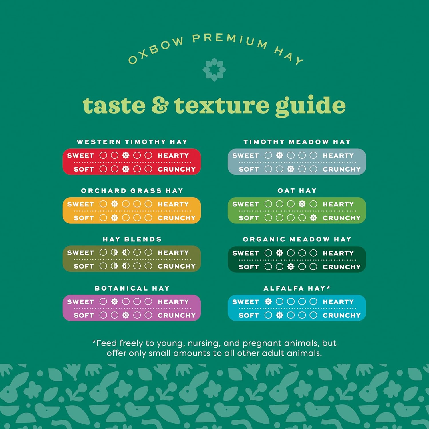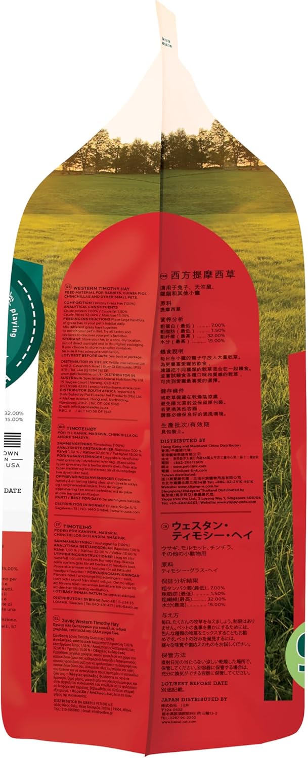 At Oxbow Animal Health, our purpose is to help people and pets live happy, healthy lives. For more than 30 years, we’ve partnered with leading veterinarians and nutritionists to develop nutrition and care products that meet the specific species and life stage needs of rabbits, guinea pigs, chinchillas, hamsters, gerbils, rats, and mice. From farm fresh hays and nourishing fortified foods to wholesome treats, beneficial supplements, enrichment and care, Oxbow products are used and recommended by leading veterinary professionals and passionate pet parents worldwide. Oxbow’s all-natural Western Timothy Hay is a nutritious, sweet-smelling grass that will stimulate the appetite of your rabbit, guinea pig, chinchilla, or other small pet. Western Timothy is the #1 vet-recommended hay for small herbivores. FEEDING INSTRUCTIONS: Place large handfuls of grass hay in your pet’s habitat daily. Mix different grass hays together to enrich your pet’s diet. Try all tastes and textures to discover your pet’s favorites.