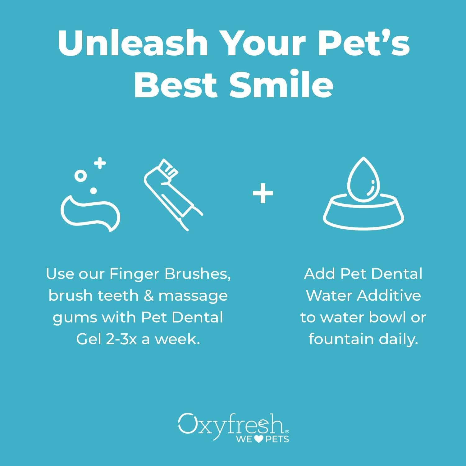 CLEANS DOG & CAT TEETH, & HELPS FIGHT PLAQUE – Get teeth sparkly clean and gums in great shape between vet visits with this dog and cat teeth cleaner and dental care solution. Both our water additive and pet toothpaste feature exclusive, non-toxic Oxygene to help fight plaque and freshen breath. GOODBYE TO BAD PET BREATH – Say goodbye to dog and cat bad breath with our gentle fresh breath treatment for puppies, dogs, kittens, and cats. Beats breath bones and dental chews that only mask odors temporarily! Made in the USA, this non-toxic formula freshens breath without harsh ingredients. PERFECT FOR THE WHOLE PACK – Our premium dental care formulas are gentle, non-toxic, and safe for dogs and cats alike. Tasteless and odorless, even the pickiest of picky pets will love it! Because when it comes to fresh breath and happy tails, Oxyfresh is perfect for the whole furry family. EASIEST DOG & CAT DENTAL KIT – Everything you need for a simple, effective pet dental routine at home! This complete kit includes our fresh breath water additive (just add to their bowl), dental gel toothpaste, and 3 gentle finger toothbrushes for easy, stress-free care. APPROVED & LOVED BY PET PARENTS – Our amazing Pet Dental Kit features safe, trusted ingredients you can always feel good about. So if you've tried everything else, it's time to try something that works. AWESOME PET ORAL CARE RESULTS › See more product details