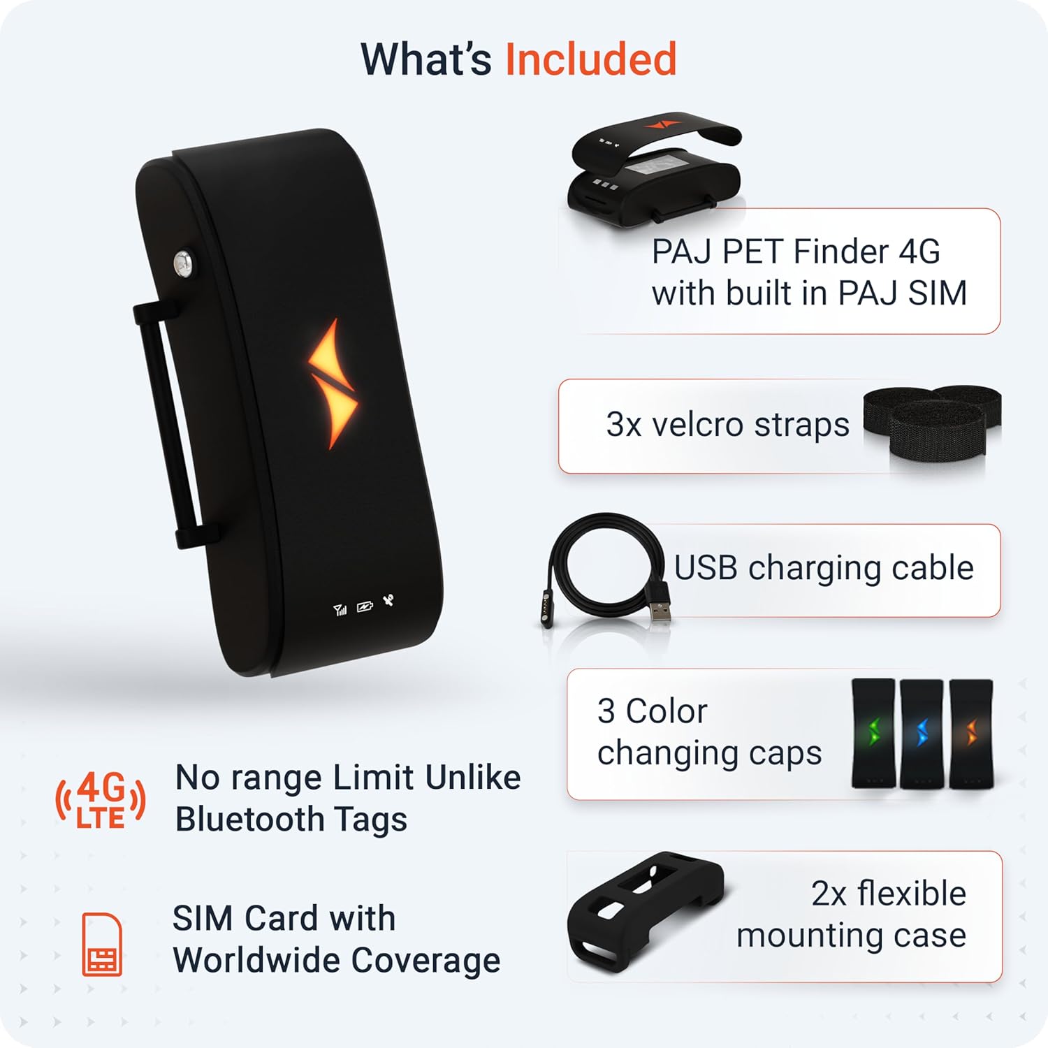 - Included Components: 2x rubber cover, 3 caps with different colors for LEDs, 3x Velcro fastener, PAJ PET Finder 4G - black, USB charging cable