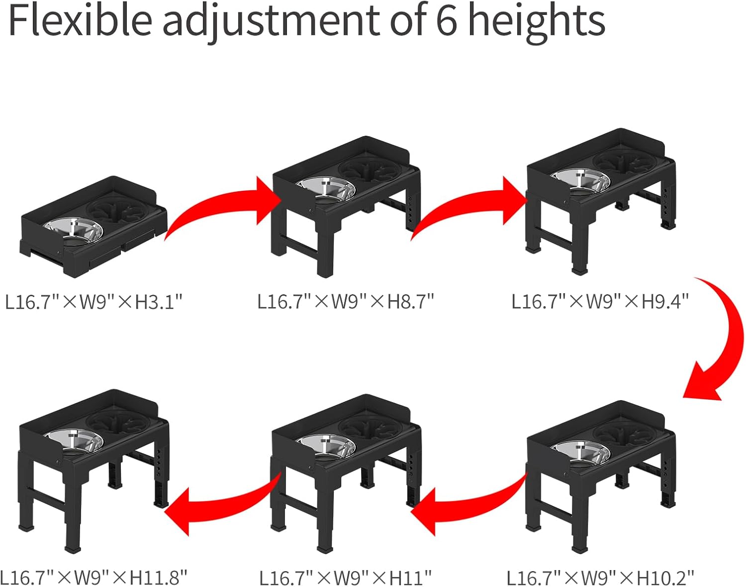 About this item Adjustable Heights for All Breeds & Ages – Our raised dog bowl stand offers 6 adjustable heights from 3.1” to 11.8”, suitable for tiny, small, medium, and large dogs. The ergonomic design helps dogs eat comfortably while reducing neck and joint strain. Raised bowls help keep food and water clean by preventing dust and floor debris from getting in, ensuring a hygienic mealtime. Tip: For very small breeds, please check the minimum height before purchase to ensure easy access. 5° Tilt Per Gear for Neck & Joint Care: Adjust front/rear legs separately for a 5° tilt per setting (10° recommended: hind legs 2 notches higher than front). This pet-friendly design reduces neck strain, supports spinal health, and eases digestion—ideal for large breeds prone to joint issues. 1.77” High Spill-Proof Baffle | The 1.77-inch raised back guard helps contain food and water splatters, protecting walls/floors from stains → perfect for messy eaters, even enthusiastic large breeds! XL Slow Feed & Stainless Steel Bowl for Big Appetites: Extra-wide slow-feed bowl curbs fast eating (reduces bloat/choking risk). Stainless steel water bowl holds ample water. Both lift out easily for quick cleaning—fresh meals, no hassle! Anti-Slip Stability + 10-Second Setup: 4 non-slip pads keep the stand steady (even for energetic eaters). No assembly: unfold legs → lock height with the button → serve! Perfect for busy pet parents. Our after-sales team is online 24/7. If you have any product-related questions, please contact us through your order, and we will provide a detailed solution as soon as possible to handle your inquiries and needs efficiently. › See more product details