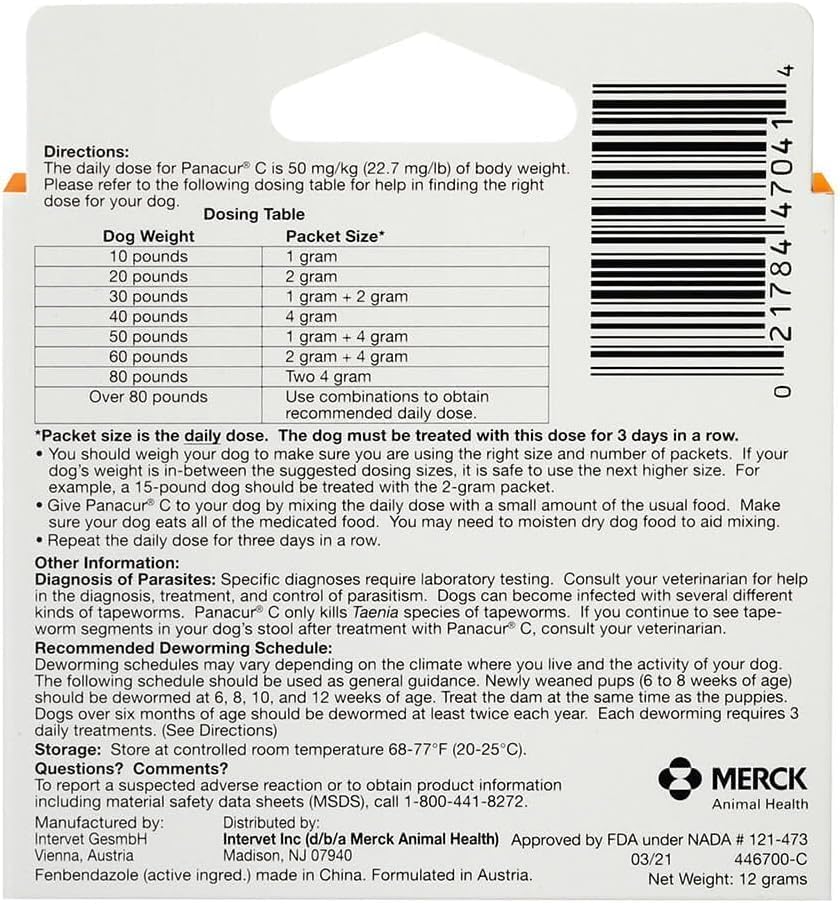 Panacur C (fenbendazole) Canine Dewormer is for the treatment and control of Roundworms, Hookworms, Whipworms and Taenia Tapeworms in Dogs. Panacur C treats all 4 major intestinal parasites in dogs. The daily dose for Panacur C is 50 mg/kg (22.7 mg/lb) of body weight. Consult your veterinarian for assistance in the diagnosis, treatment and control of parasitism. Approximately 1% of dogs had vomiting associated with the use of this product. Panacur C Canine Dewormer has no known interactions.