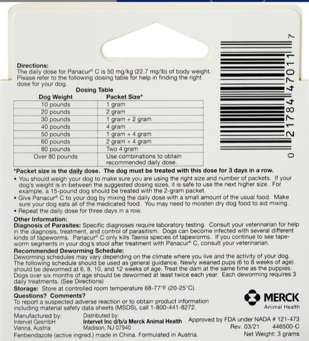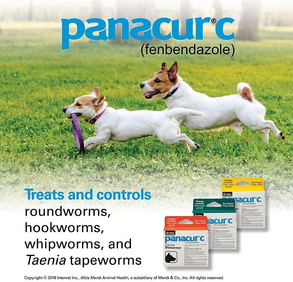 Panacur C (Fenbendazole) is a broad spectrum parasiticide used to treat hookworms, roundworms, tapeworms, and whipworms in dogs. It is also used by veterinarians to treat other parasites. It is recommended to deworm your pet twice a year.