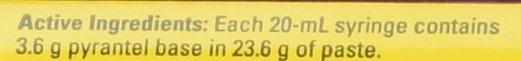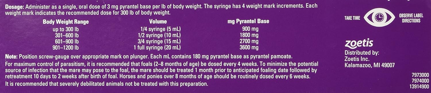 - Directions: Dosage Single Oral Dose Of 3 Mg Pyrantel Base Per Lb of Body Weight. Each Syringe Treats 1,200 Lbs.